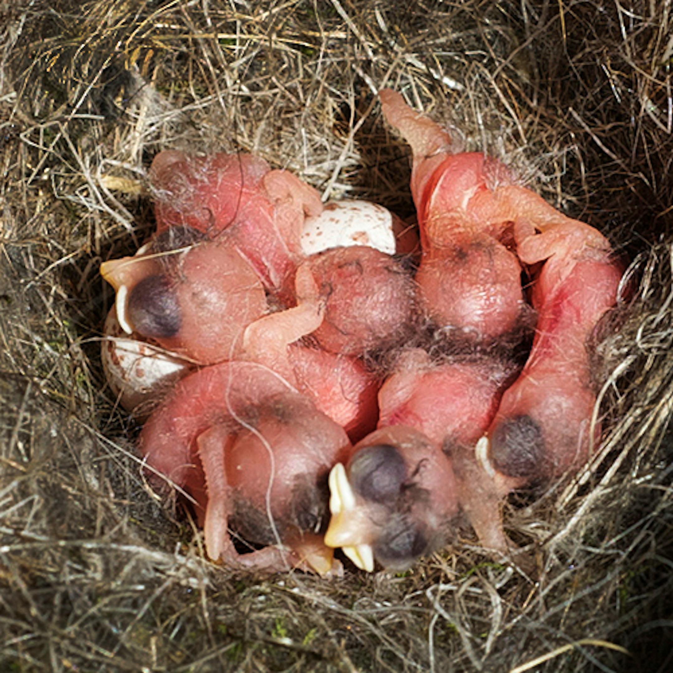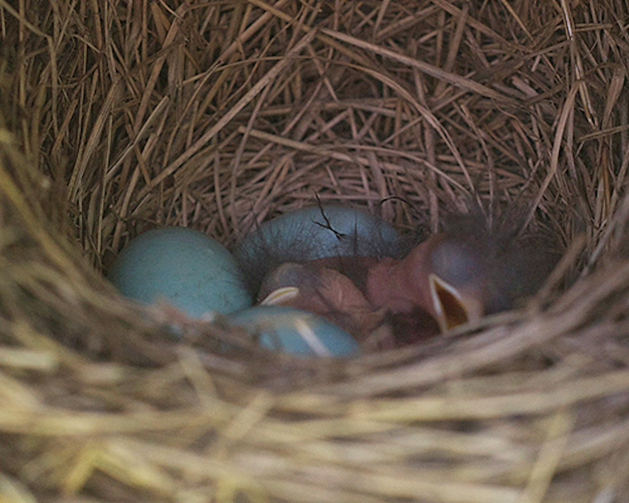 Of the 44 bird nest boxes I tend at a golf course near our home, 36 are occupied as of May 31. There are 15 bluebird nests, 20 Tree Swallows nests, and one chickadee nest. Below are photos from those nests. The first shows Black-capped Chickadee hatchlings. I count six hatched birds and three eggs that had yet to hatch. I believe the chicks hatched just hours before my visit. The round parts are heads. The dark bulging circular parts are unopened eyes. The bird at bottom center show us its beak, the lighter portion defining the gaping mouth the bird will present to a parent delivering food. The eggs are about the size of a dime. The nest is within a four-inch section of PVC pipe. The second photo shows two newly hatched Eastern Bluebirds and three unhatched eggs. Those eggs, measured end to end, are about three-quarters of an inch long. The chick images are blurry, but you can see the bulging round eye and the wide mouth on the bird at right, and a portion of the mouth of the second bird, center. The third photo shows six Tree Swallow eggs, nestled in a nest of grass and feathers. Tree Swallows always include feathers in their nests. The feathers are believed to help in temperature control. The swallow nest also is in a box made from four-inch PVC pipe. The blue bluebird eggs and the white swallow eggs have no markings. Both species are cavity nesters, making egg camouflage unnecessary. The chickadee eggs are spotted even though chickadees use cavities for their nests. That must mean that some chickadee nests are or historically have been exposed to predator eyes.