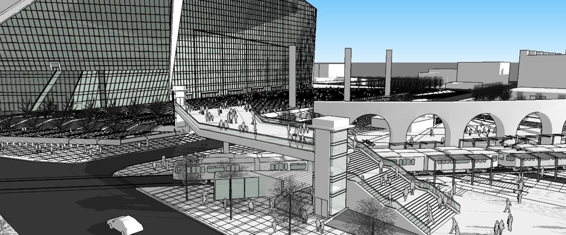 The $8.7 million walkway would extend from the stadium, stretch over the light-rail tracks and deposit pedestrians on a nearby public plaza, presumably out of harm's way.