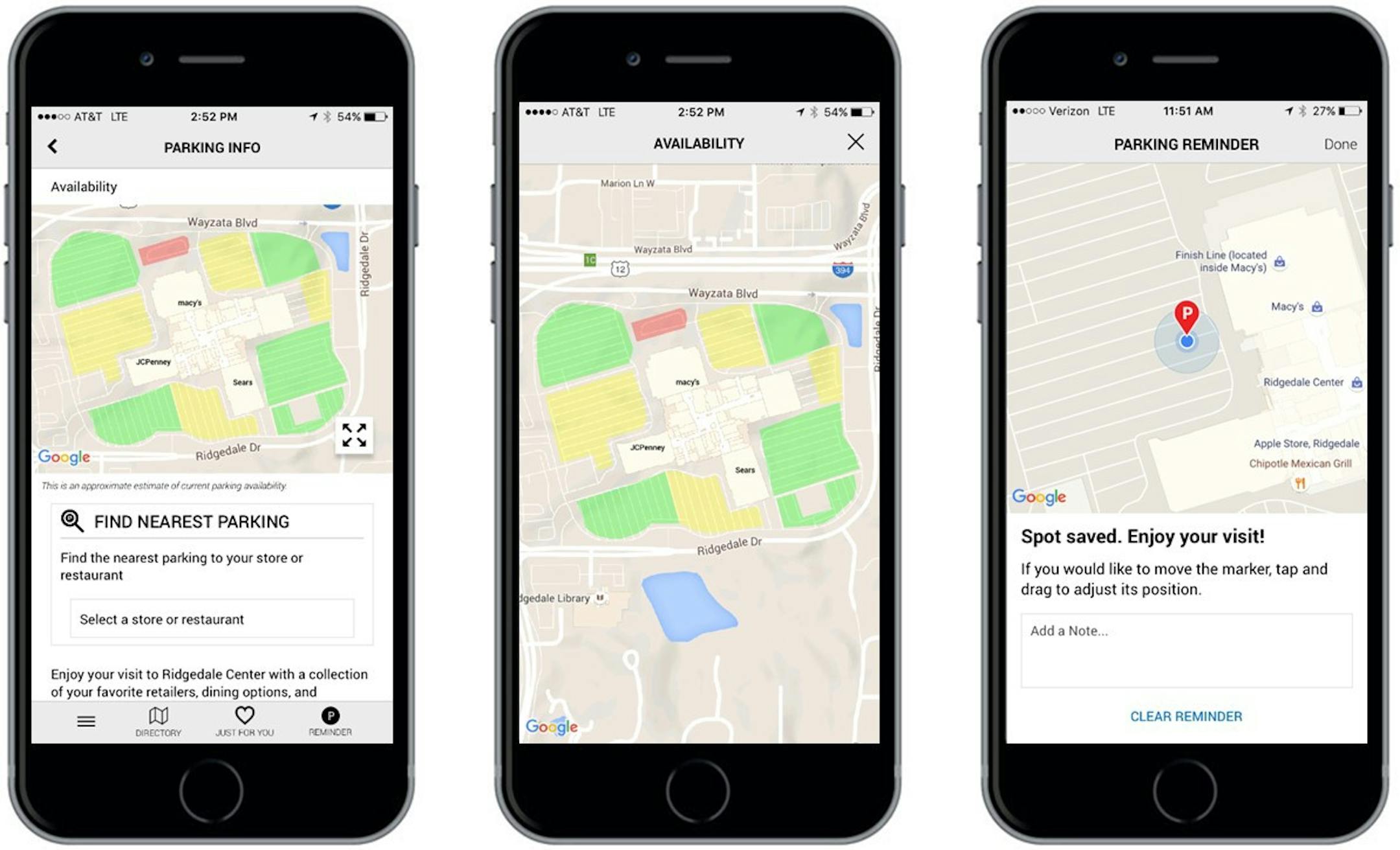 When users open the GGP app, users select the mall they want to visit and tap on parking. They then are taken to a map of the mall with the parking lots around it showing up as green, yellow or red depending on how full they are. On Tuesday morning, all of the spots around Ridgedale were green. GGP executives note that the tool will be most useful during big shopping events.