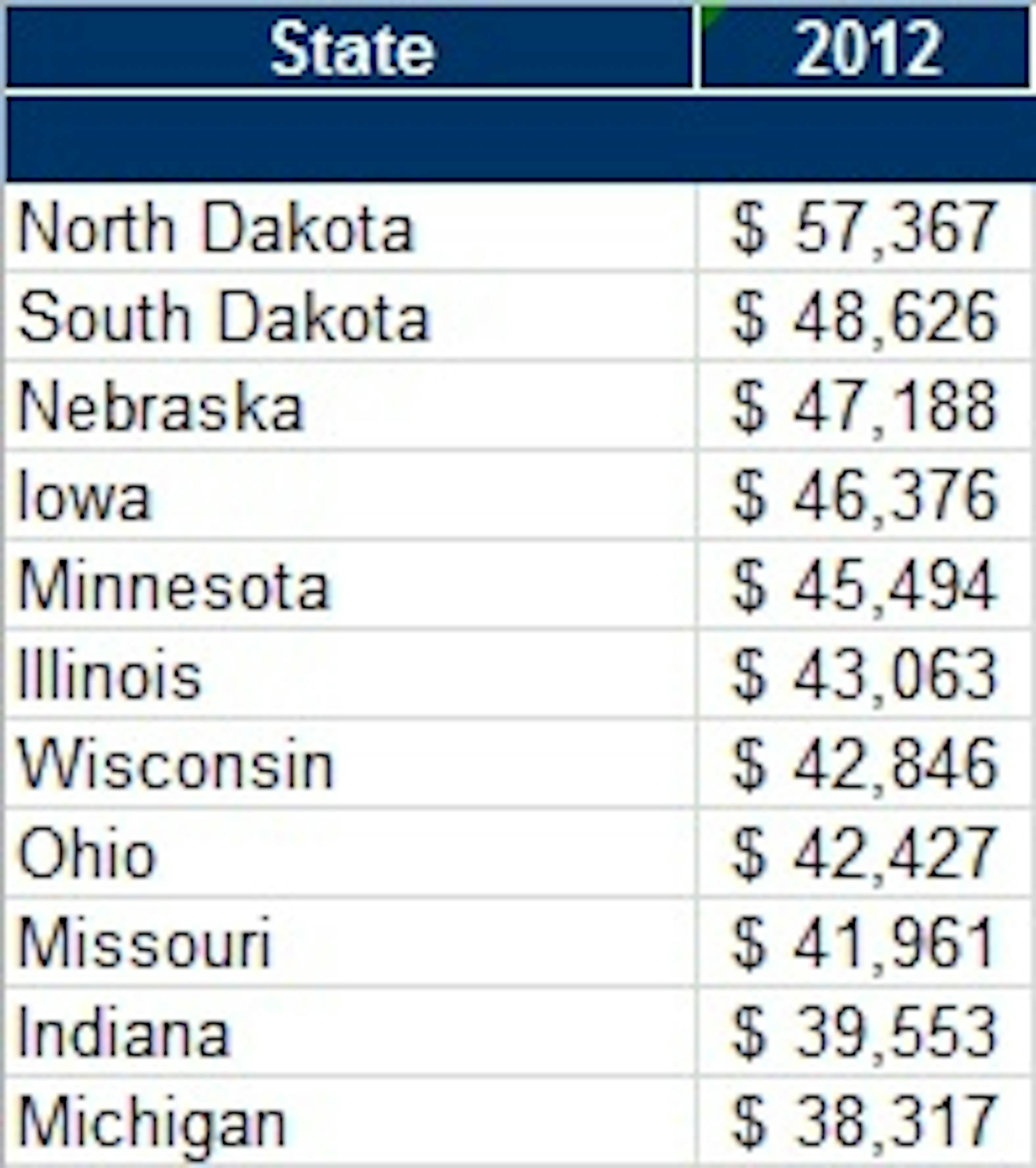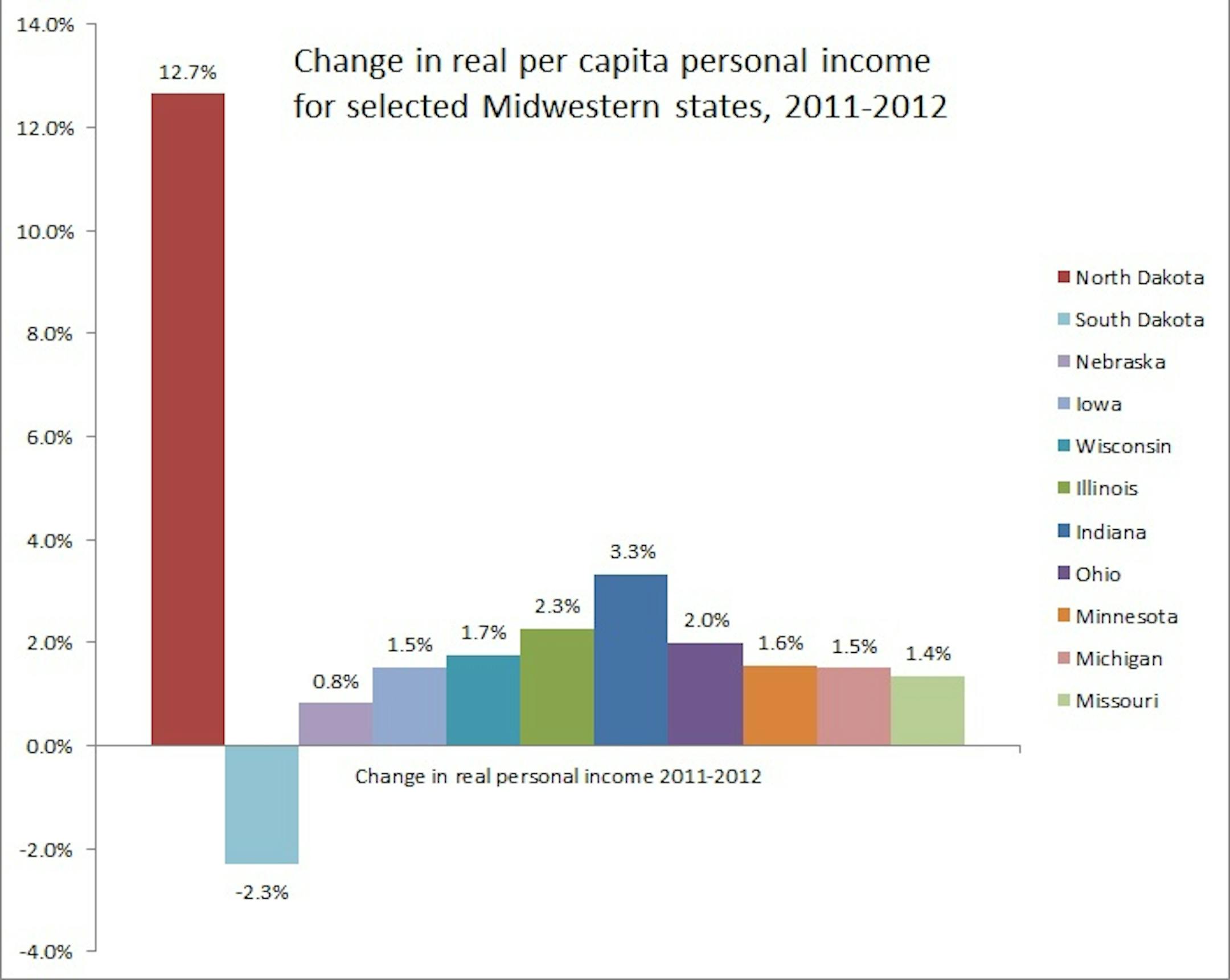 Real per capita income in North Dakota soared in 2012 by 12. 7 percent, according to new data released by the Bureau of Economic Analysis. Real income in Indiana grew at an above-average pace too, but as you can see, North Dakota is in a class by itself.