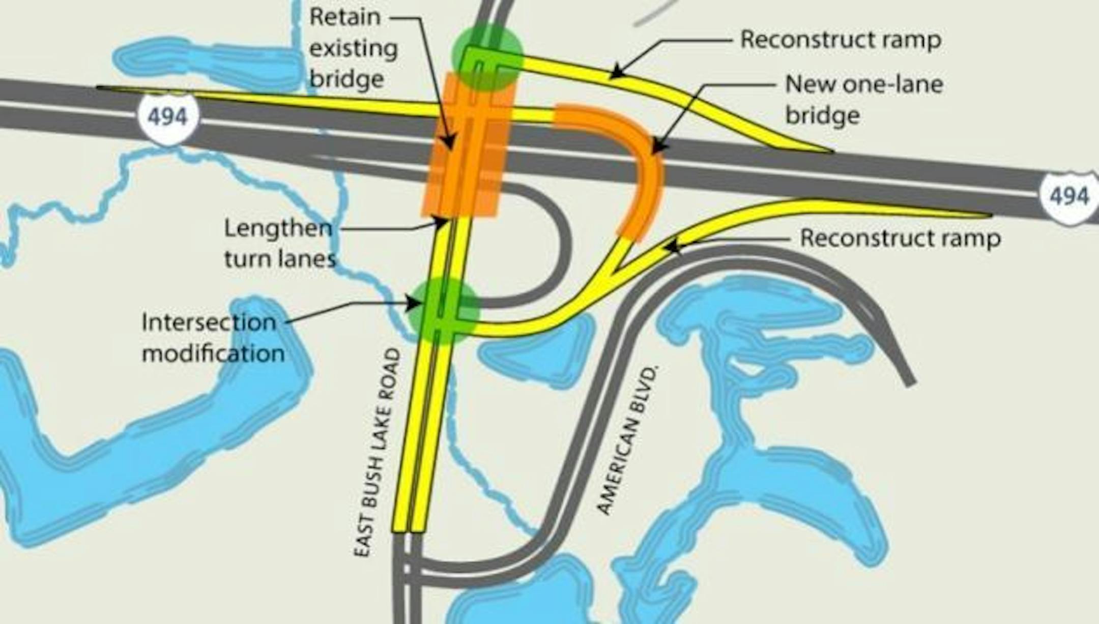 The interchange built in 1960 had only three ramps. Both eastbound and westbound drivers on Interstate 494 could get off at East Bush Lake Road. But drivers on East Bush Lake Road could only access eastbound Interstate 494 with no option to access westbound I-494.