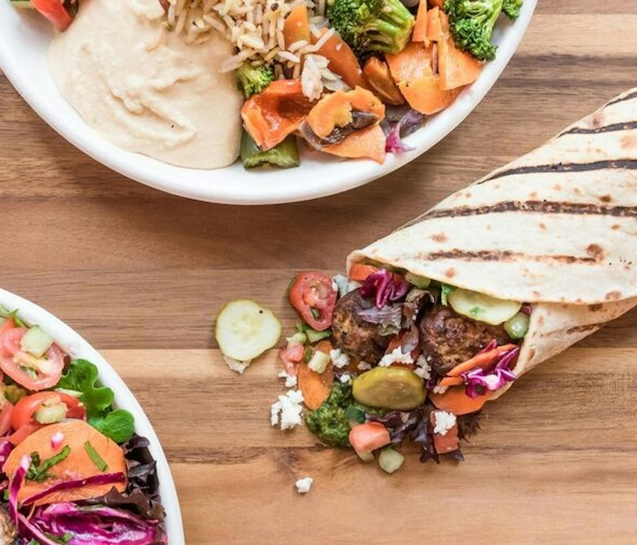 The Chipotle-style setup touts customizable meals – salads, rice plates, sandwiches or wraps – that feature proteins such as spicy lamb meatballs, falafel, steak, chicken and salmon kabobs topped with various pickled vegetables, salads and sauces.