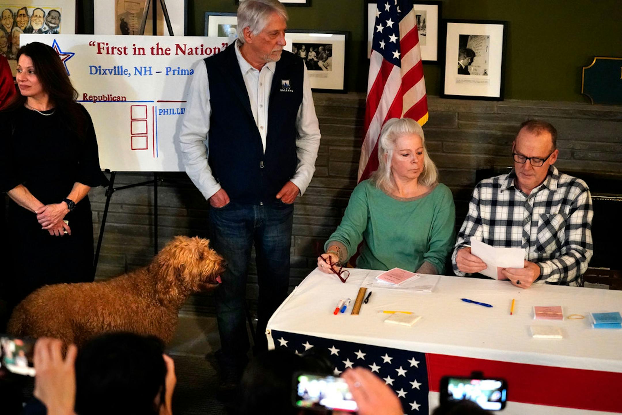 The voting took place in a new location, the living room of Tillotson House, with the Balsams Resort undergoing renovations. It made for a congenial setting, with an 11-month-old golden retriever named Maxine greeting media and voters.