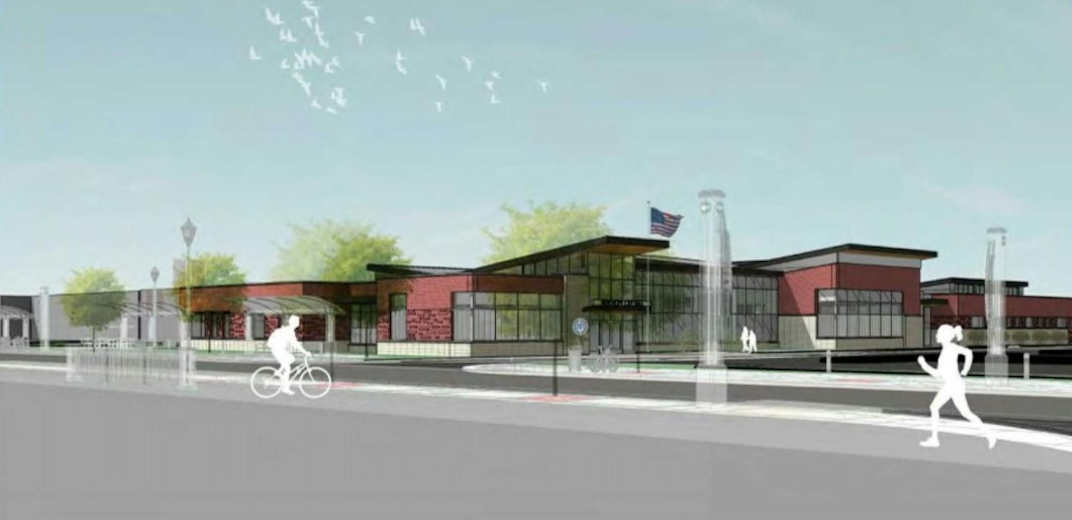 The new building's design, from Wold Architects, emphasizes red brick to complement the Xylon Avenue streetscape and the surrounding structures. Its exterior facades feature brick and glass, with stone masonry veneers and metal accents adding visual details.