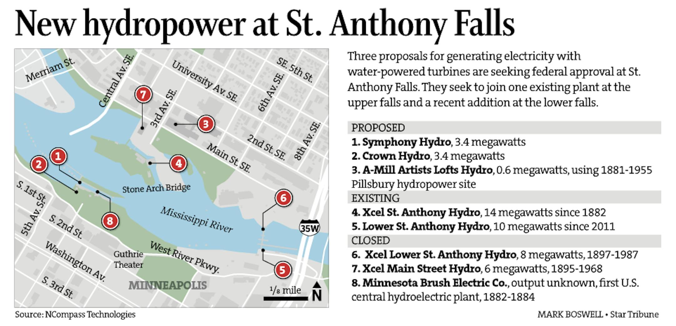 Three proposals for generating electricity with water-powered turbines are seeking federal approval at St. Anthony Falls. They seek to join one existing plant at the upper falls and a recent addition at the lower falls.