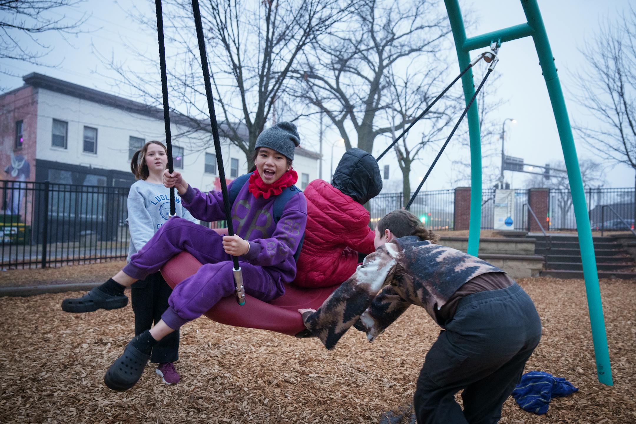 The last of the major playground pieces came together in late October, and on Tuesday, several student leaders — now sixth-graders — climbed onto one of the inclusive play area’s most coveted features: a saucer-like “Oodle Swing” that allows kids to sway on it together.