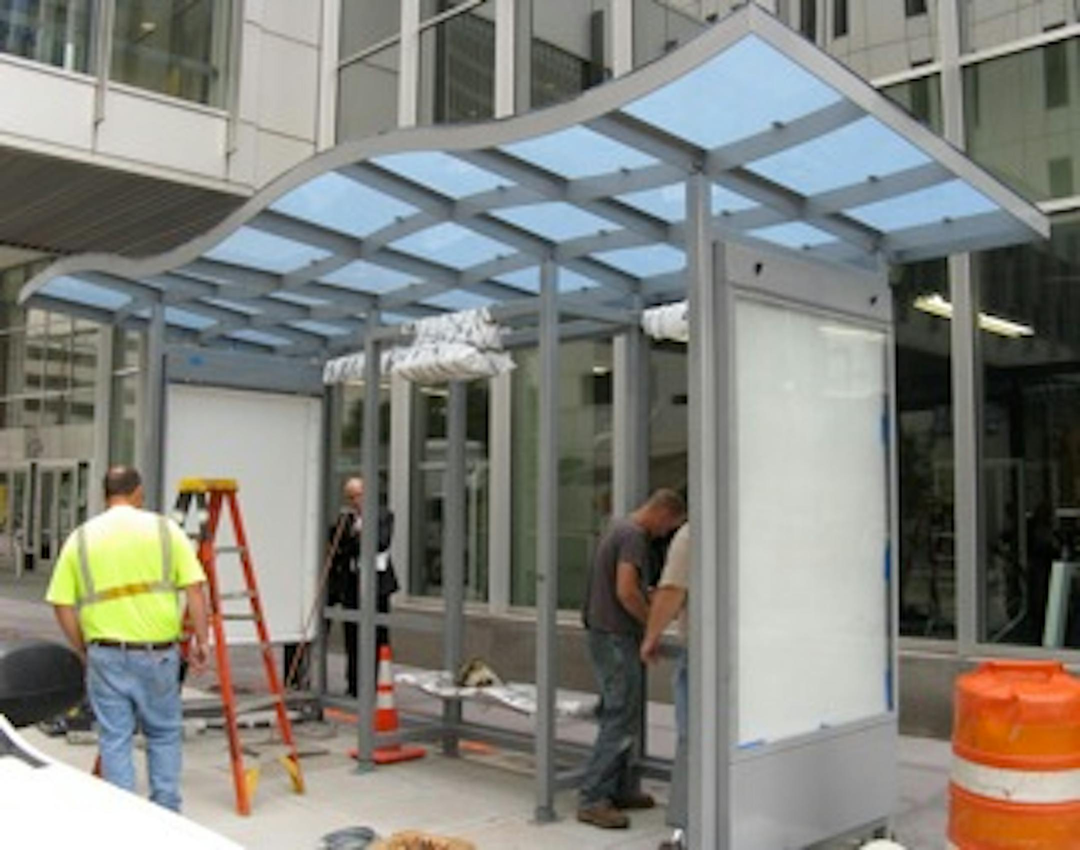 Workers working Wednesday on new bus shelter / Photo by Rick Nelson Here's what's apparent from the get-go: It's roughly 500 times better looking than the tacky and increasingly shabby greenhouse-inspired eyesores lining Nicollet Mall, which, by the way, just might be supplanted as downtown's most pedestrian-friendly thoroughfare once this ambitious 2-mile, $32 million project is finally finished next year. One concern: Will the advertising panels that bookend the structure (a change from prototype images, which feature clear glass on one end and advertising on the other) make it difficult for pedestrians to see oncoming buses or, for that matter, potential bad guys?