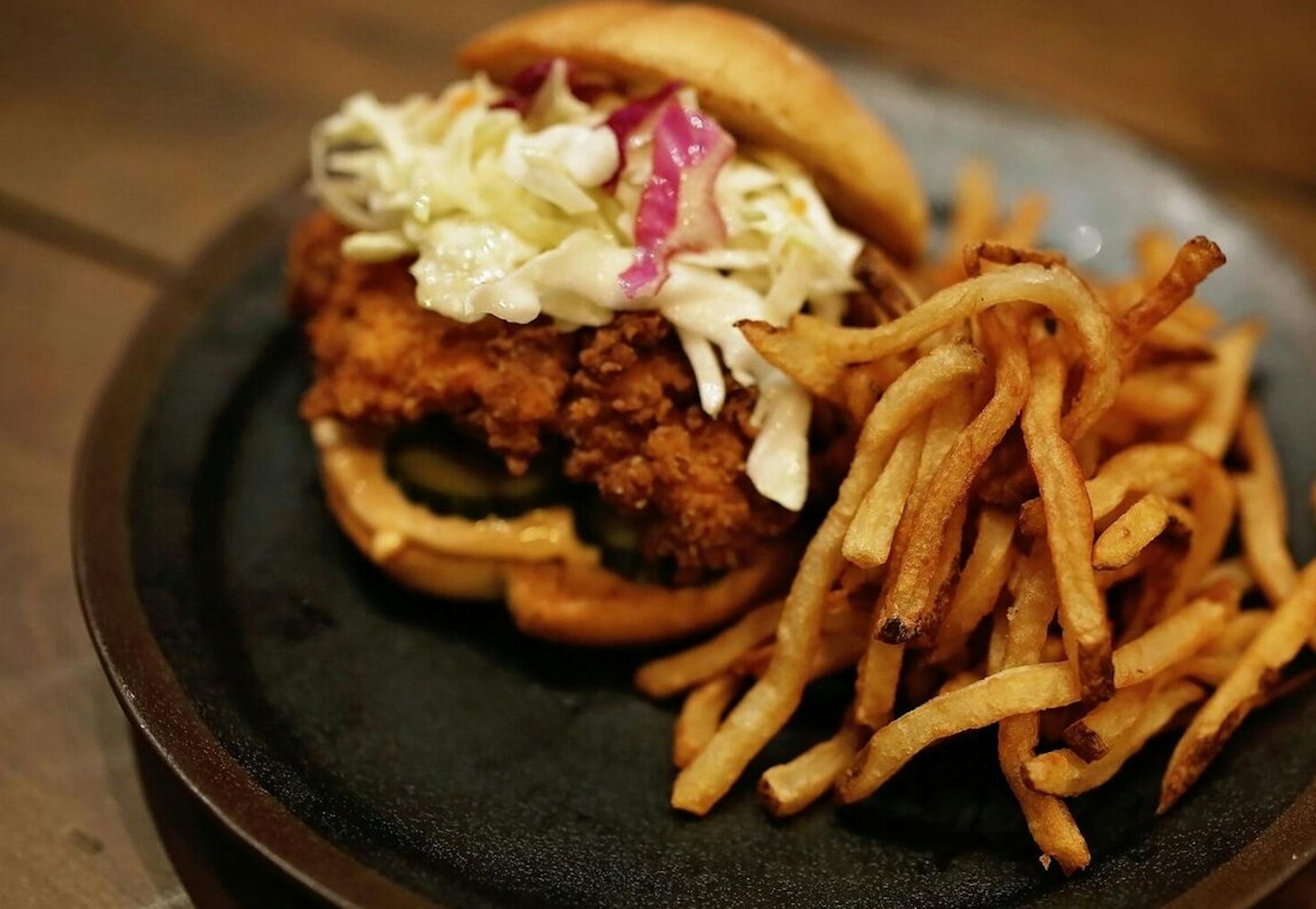 Bushel & Peck Cafe, the remade version of the former Mill City Cafe, has a new menu that focuses on slightly ramped-up versions of classic lunch fare. A lineup of burgers and sandwiches include a Montreal brisket sandwich, a fried chicken sandwich (see below) and a goat's milk feta sandwich. Other items include a harissa salmon and millet salad, Thai chicken lettuce wraps and avocado toast.