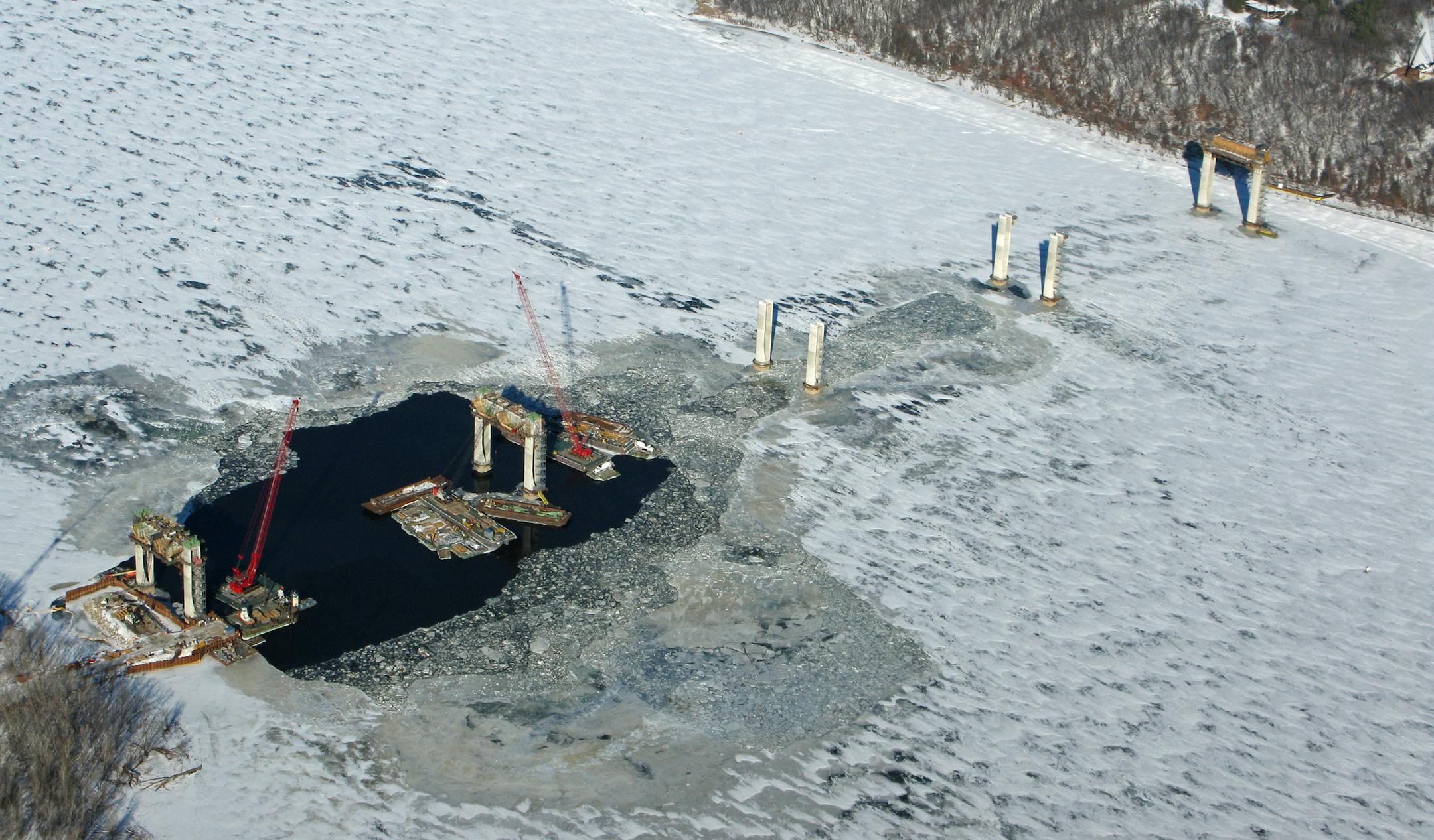 These fish see the new bridge, too, from beneath the winter's ice, where huge concrete blocks, or footings, rest on the river bottom, encasing the structure's five double-columned support piers that rise to the river's surface through more than 135 feet of bedrock, sandstone, gravel, mud and water.