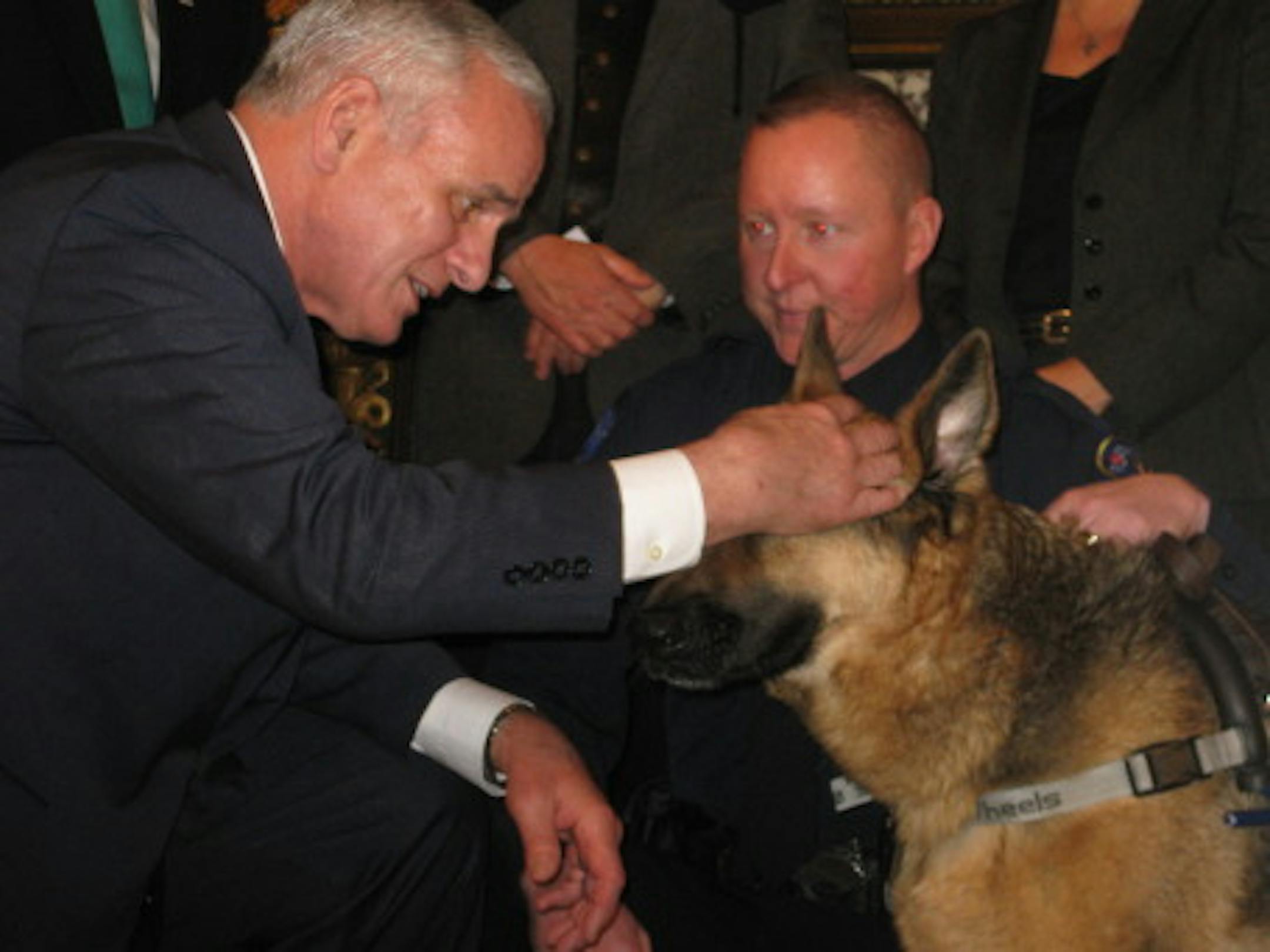 Sitting alongside a paralyzed police dog, Gov. Mark Dayton signed a bill into law Tuesday that increases penalties, including restitution costs, for people who injure or kill dogs used by public safety agencies.