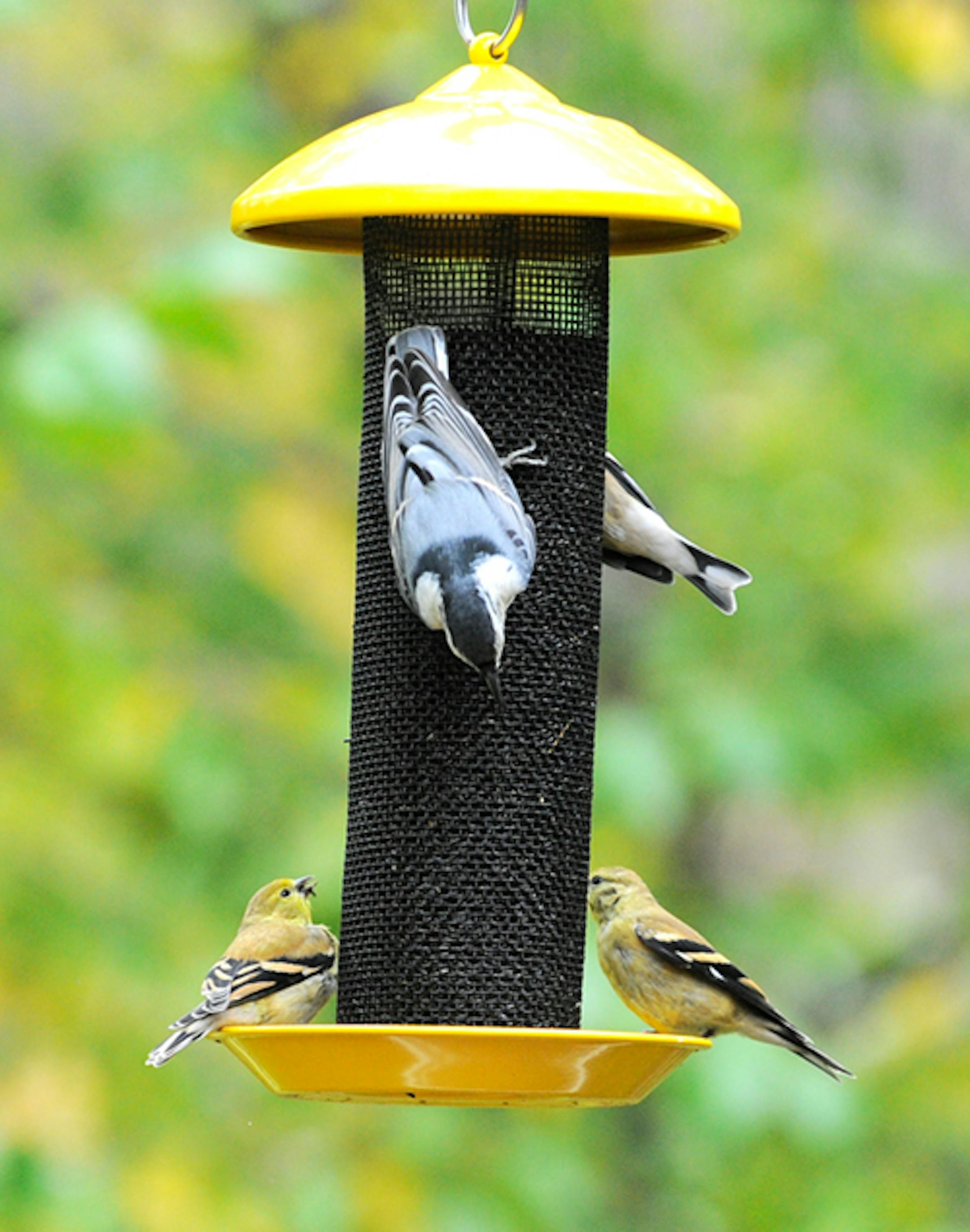 There have been no goldfinches at our sunflower-seed feeders for a couple of weeks. Saturday I hung a new thistle-seed feeder. Sunday morning we had goldfinches, thistle-seed eaters. A coincidence? That thistle feeder, by the way, was more popular than expected. I hung it for use by finches, hoping we see redpolls and siskins this winter. The feeder got immediate attention from goldfinches, House Finches, chickadees, a nuthatch, and a Downy Woodpecker.