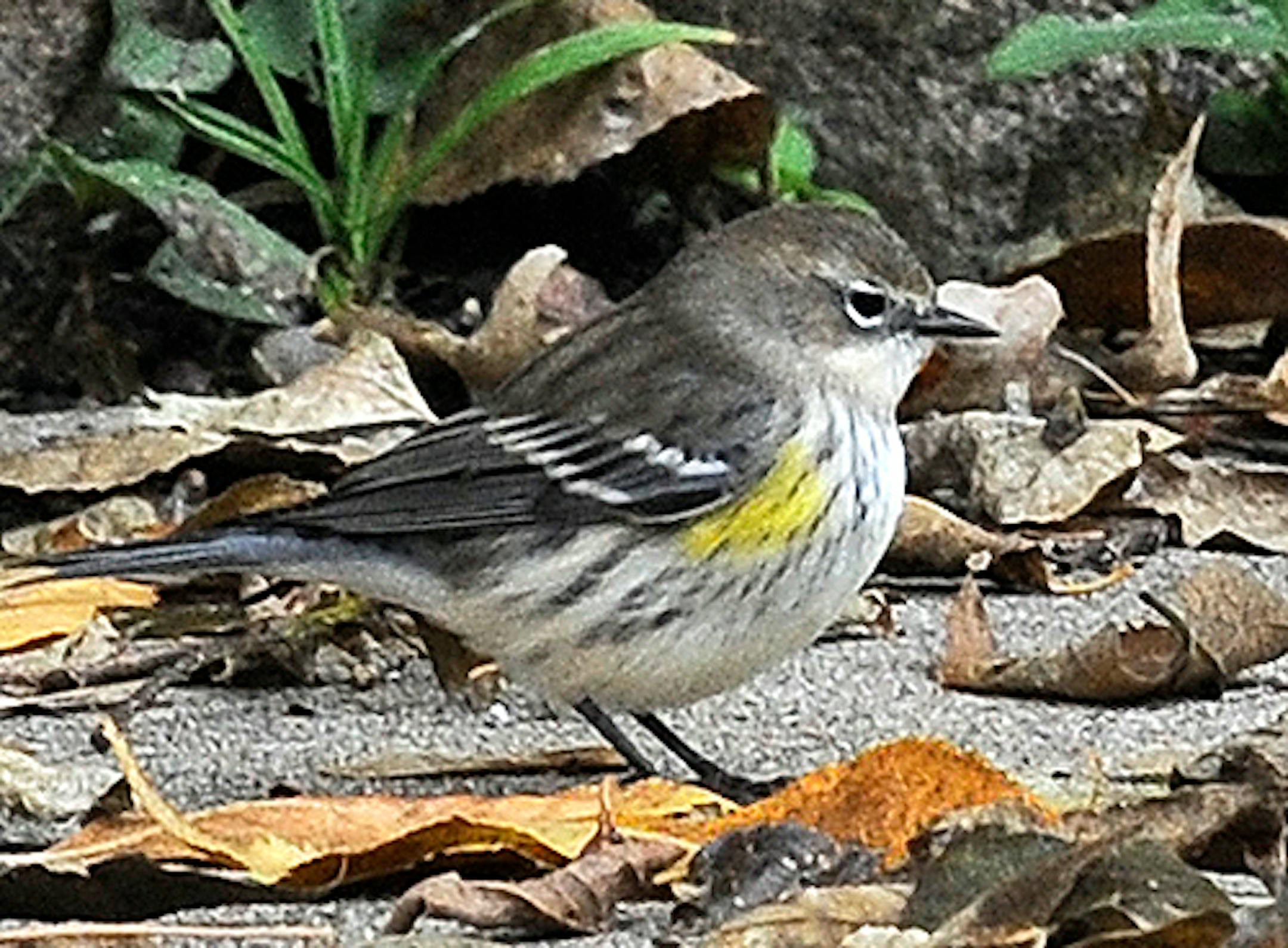 Sunday, in the front yard, our hackberry trees held at least a dozen robins feeding on the berries. Migrant Yellow-rumped Warblers were in the trees and on the driveway beneath, ignoring fallen berries, but finding something to eat, whatever it was too small for me to see. Yellow-rumps often are the first warbler species to arrive in the spring, and generally the last to leave in the fall.