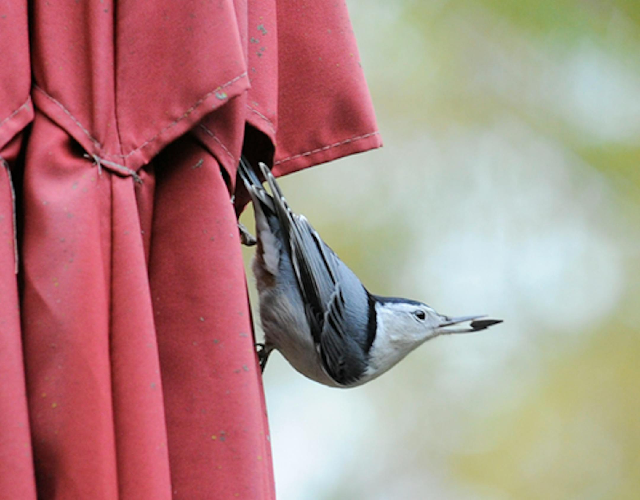 Then, there is the White-breasted Nuthatch retrieving sunflower seeds it had hidden in the folds of our deck umbrella.