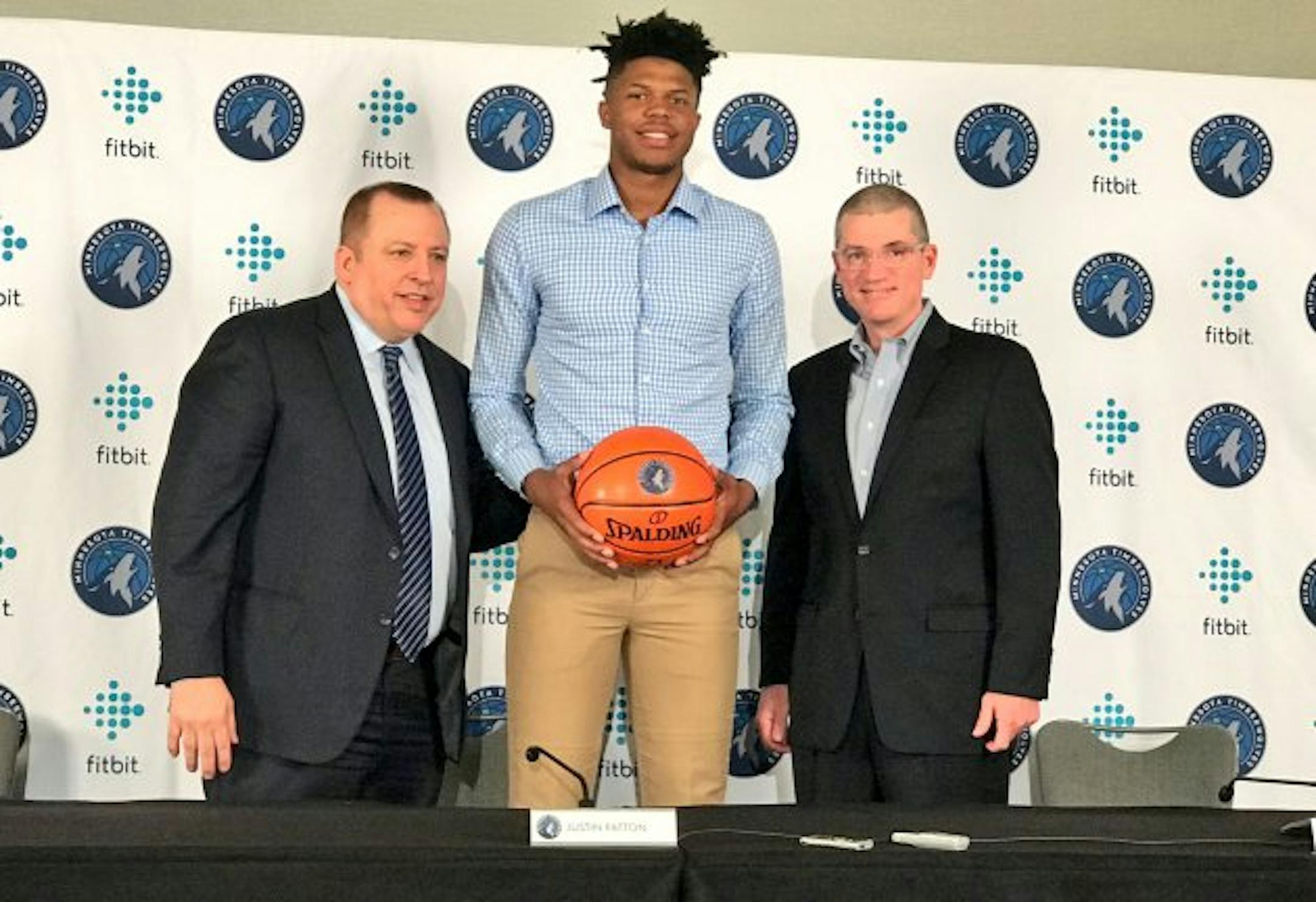 Tom Thibodeau, Justin Patton and Scott Layden. Timberwolves photo.