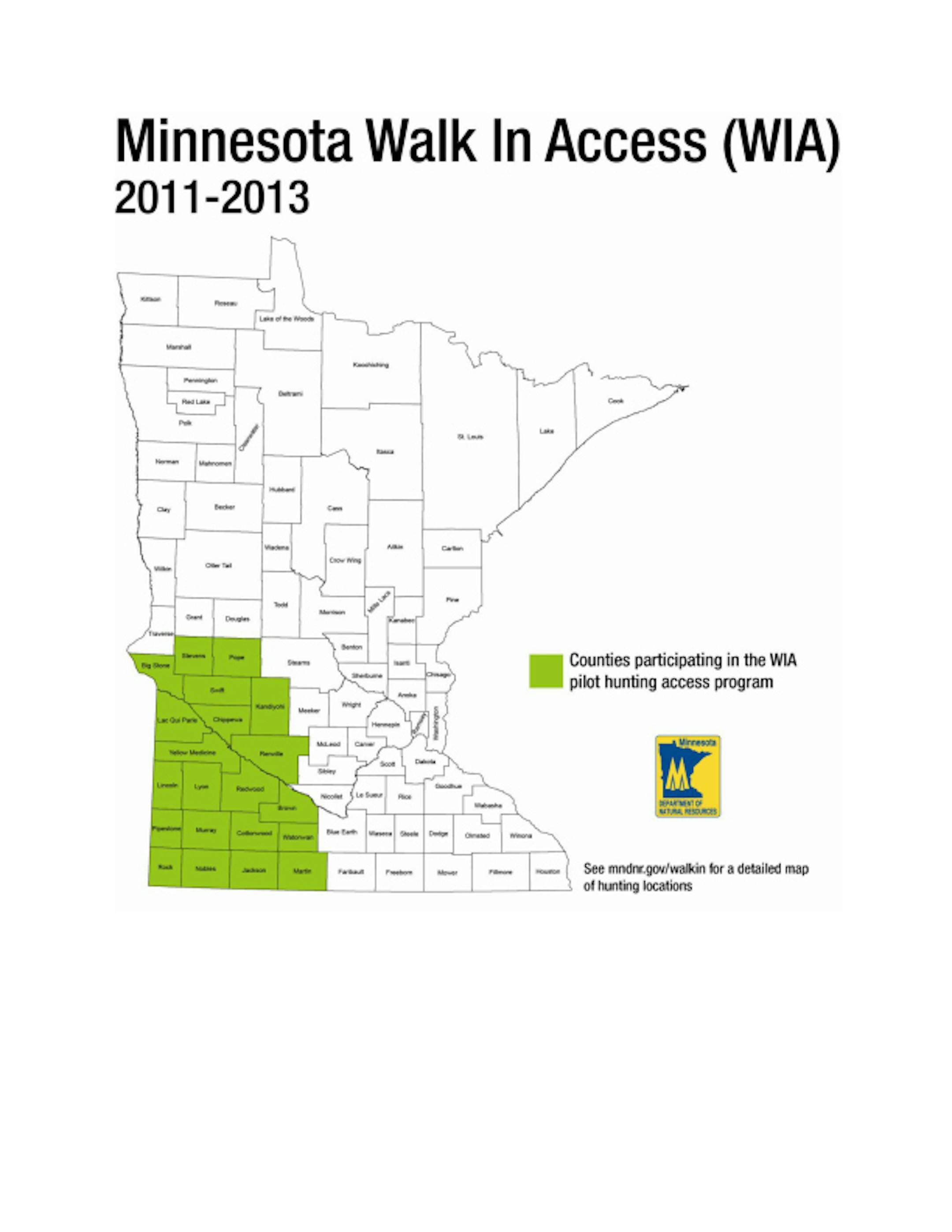 So far landowners have enrolled about 7,700 acres in Minnesota's new walk-in hunting program, which will provide hunters free access to private lands. Landowners in 21 southwestern Minnesota counties have until Friday to enroll land in the program. DNR officials earlier had hoped to have up to 10,000 acres by this fall, but now likely will fall short of that. "Ten thousand acres was a bit ambitious,'' said Marybeth Block, walk-in program coordinator. She said about 8,500 acres could be enrolled by the shut-off date. "We're pretty happy. That will be a decent start,'' she said. The three-year pilot program, which pays landowners $10 to $13 per acre to allow access, is expected to grow. The DNR wants to enroll 25,000 acres by 2012 and 50,000 acres by 2013. Crews are expected to start putting up signs on the enrolled lands beginning Aug. 22, Block said. Interested landowners can sign up at their local Soil and Water Conservation District (SWCD) office. To be eligible, landowners must enroll a minimum of 40 acres that are currently enrolled in the Conservation Reserve Program, Conservation Reserve Enhancement Program, Reinvest In Minnesota or Wetlands Reserve Program. The program is funded by $2.7 million from the U.S. Department of Agriculture's (USDA) Voluntary Public Access Program. Only walk-in hunting traffic is allowed on enrolled acres, which are not open to trapping, trap shooting, dog training or activities other than hunting. No vehicle traffic is allowed. Parking is along roads or in designated parking areas. Landowners who enroll 160 or more acres receive a bonus. Bonuses also are paid if the land is within one-half mile of other public hunting land, such as a wildlife management area or waterfowl production area. Landowners who sign multi-year contracts also are eligible for bonuses.