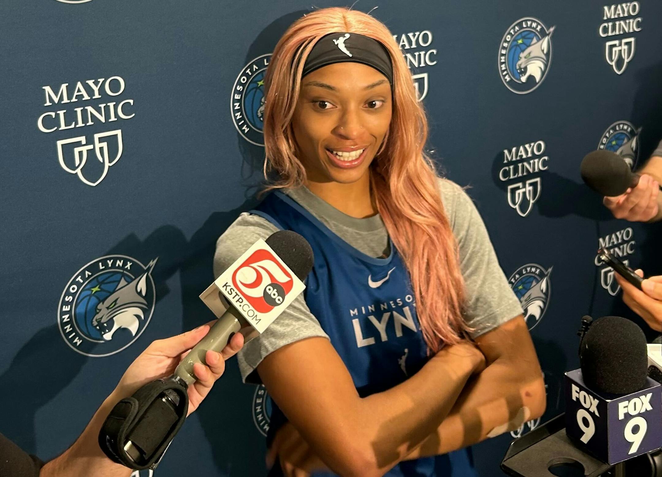 Carrington spoke with reporters Thursday following her first practice at The Courts at Mayo Clinic Square. After walking through sets with associate head coach Eric Thibault and shooting with assistant coach Lindsay Whalen, she stepped off the hardwood. Carrington briefly caught her reflection in a nearby window, brushing her rose gold hair into place.