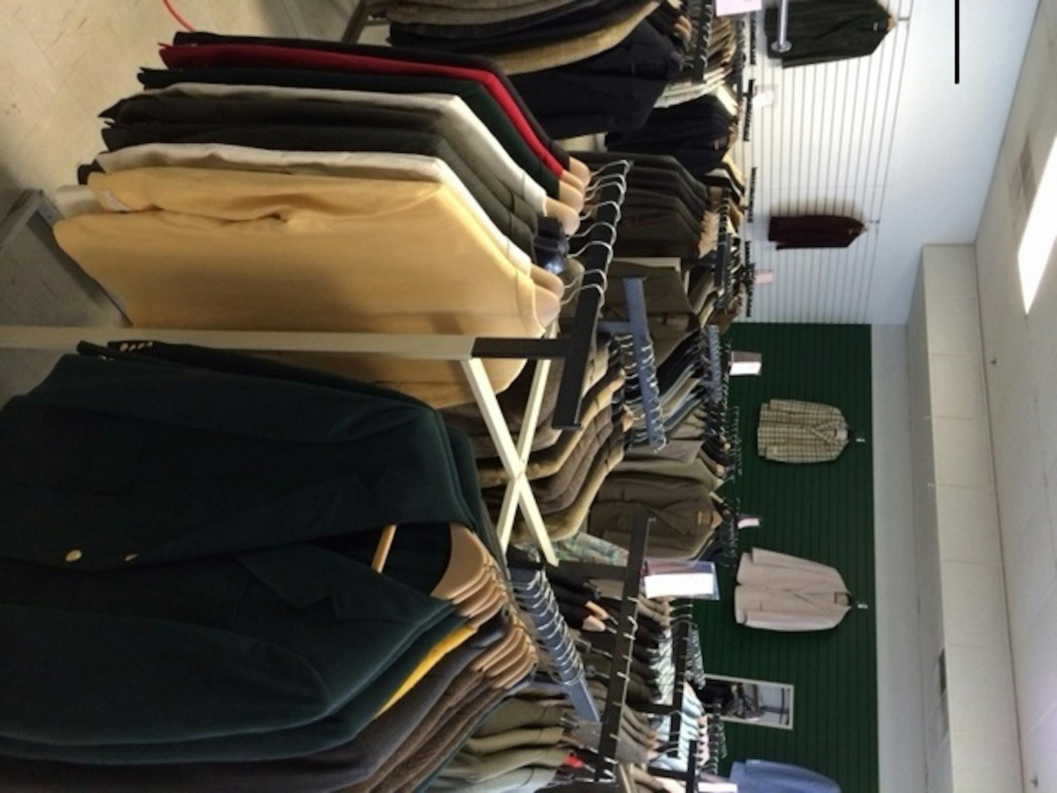 Men's suits ($35) and sport coats ($29), all seasons, range in size from 36 to 52 with shorts and longs, mostly 39-44. Also, plain and patterned unisex Ralph Lauren tees $9 (reg. $35-$45),slacks $15,and Bermuda shorts $13.