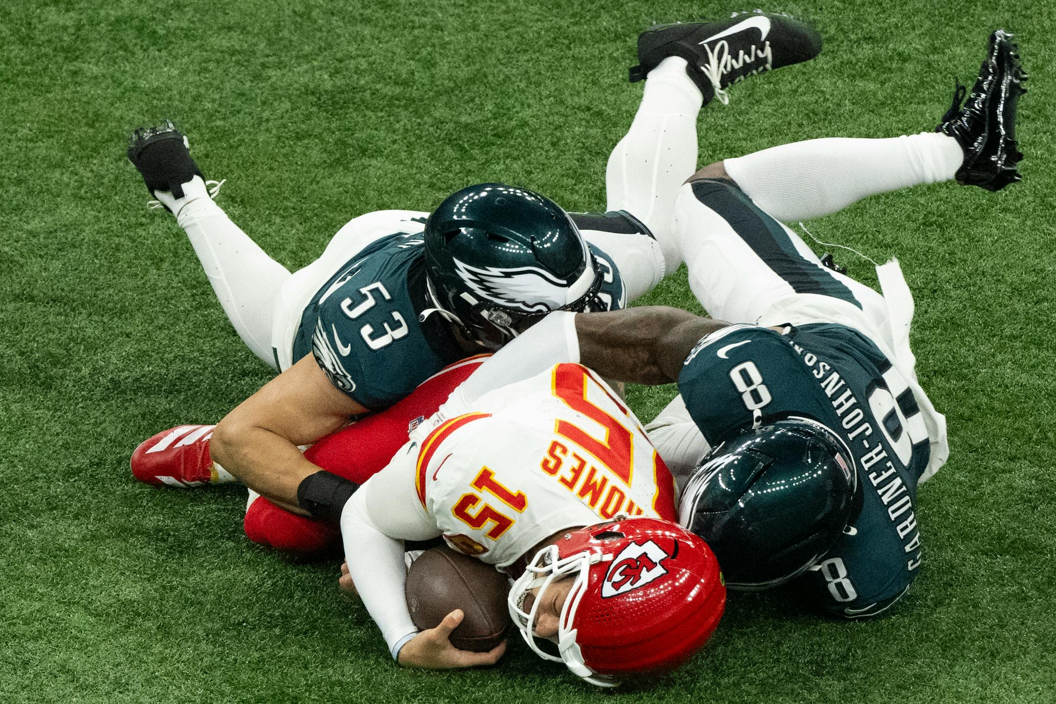 How can a league that promotes entire units performing clownish end-zone celebrations be so nitpicky when it comes to 15-yard “taunting” penalties? Eagles linebacker Nolan Smith Jr. made a great tackle, stopping Cowboys running back Miles Sanders for no gain, flexed and was flagged. Maybe this week in Kansas City Nolan should run 50 yards into the end zone to perform a duck-duck-GOOSE ensemble instead.