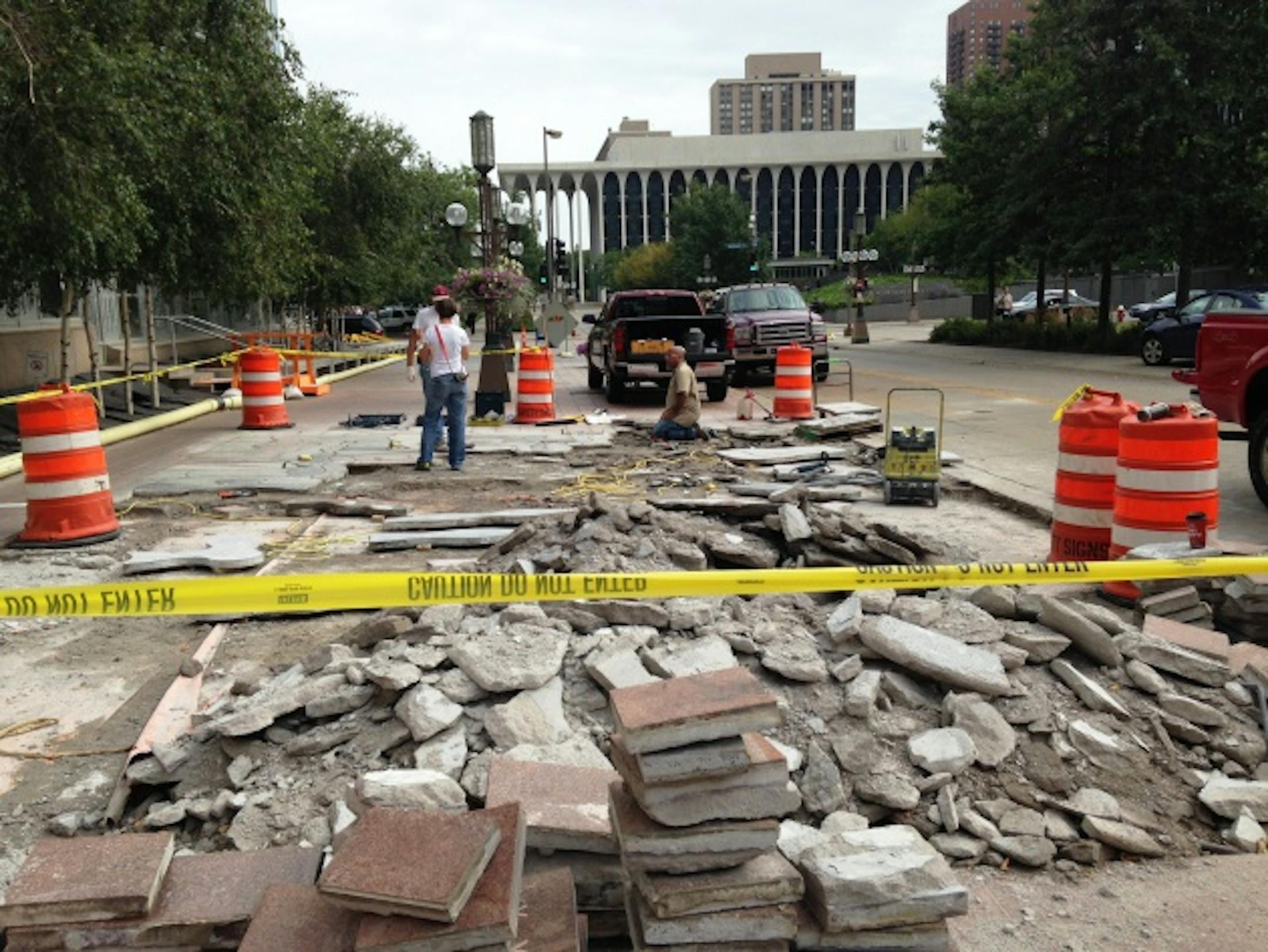 The removal is being performed by Twin City Tile and Marble Co., which also handled the excavation of the work at IDS. Altman said the removal, which is complicated by the curved lines between the 14 different colors of the granite pieces comprising the work, is happening under the supervisor of an outdoor sculpture conservator.