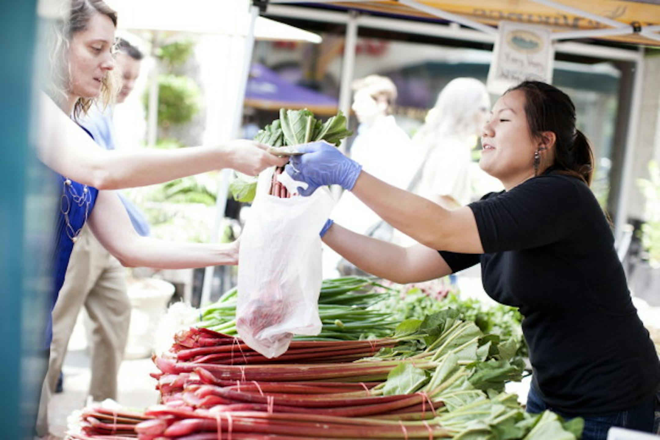 Above: Maykou Yang, right, sells rhubarb from Afton at Xang Vang's farm stall at the Minneapolis Farmers Market on Nicollet Mall June 5, 2014. (Courtney Perry/Special to the Star Tribune)