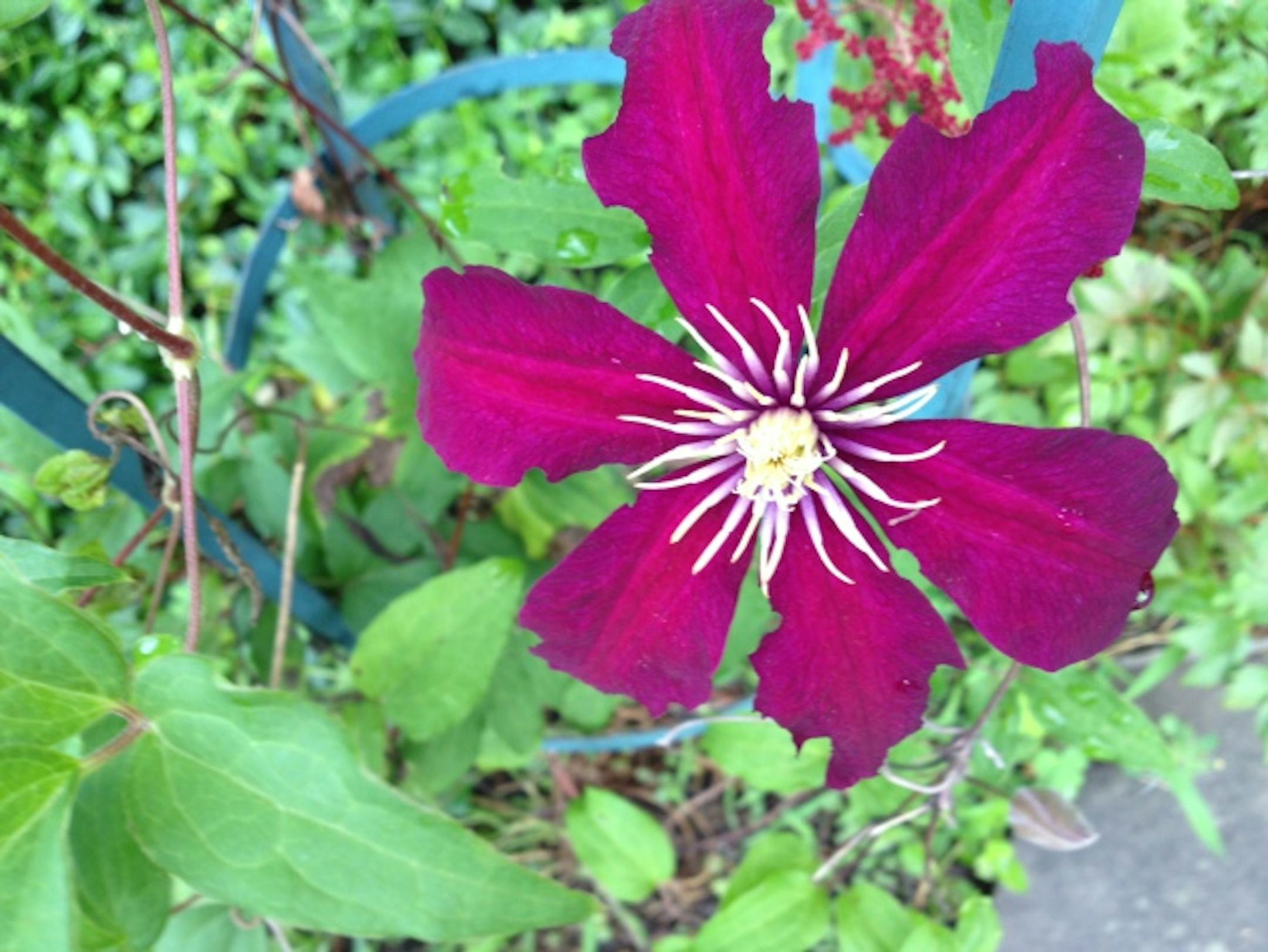My clematis is in glorious red-purple bloom, with more flowers to come. The ligularia and delphinium are about to burst forth, adding golden yellow and brilliant blue to the garden palette.