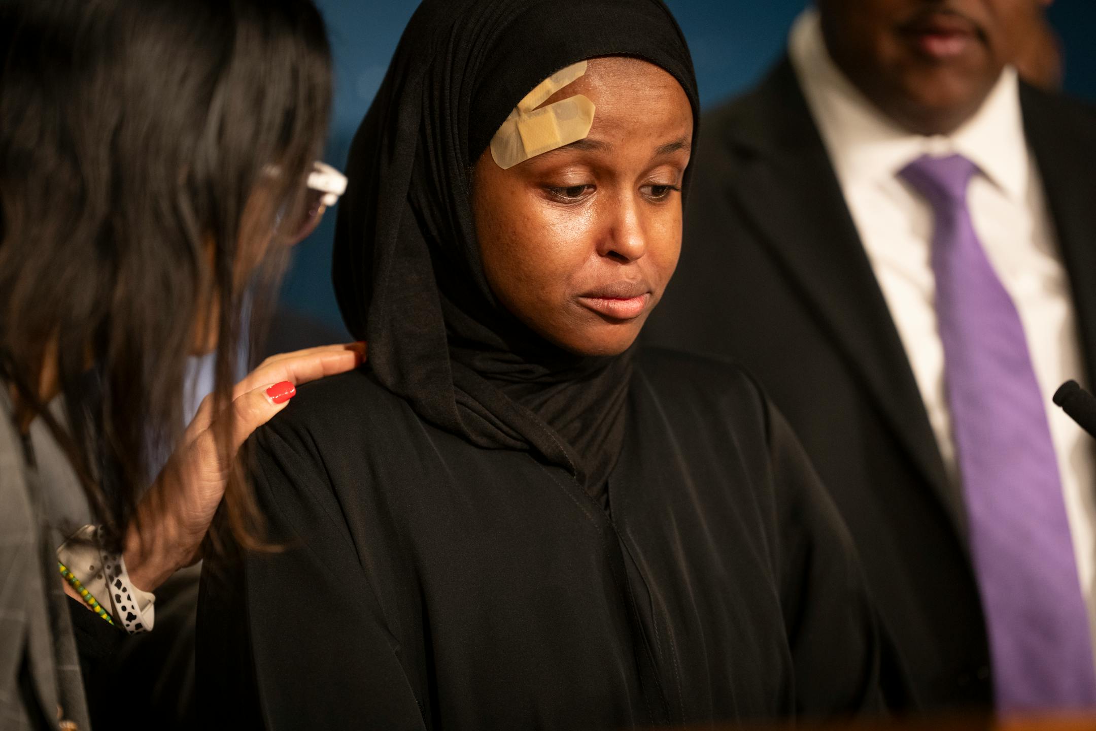 Nasra Ahmed, a U.S. citizen born in the U.S., was detained by I.C.E. for two days before being released without explanation. She becomes emotional talking about her experience being detained during a press conference at the Minnesota State Capitol in St. Paul on Jan. 21. (Renée Jones Schneider/The Minnesota Star Tribune)