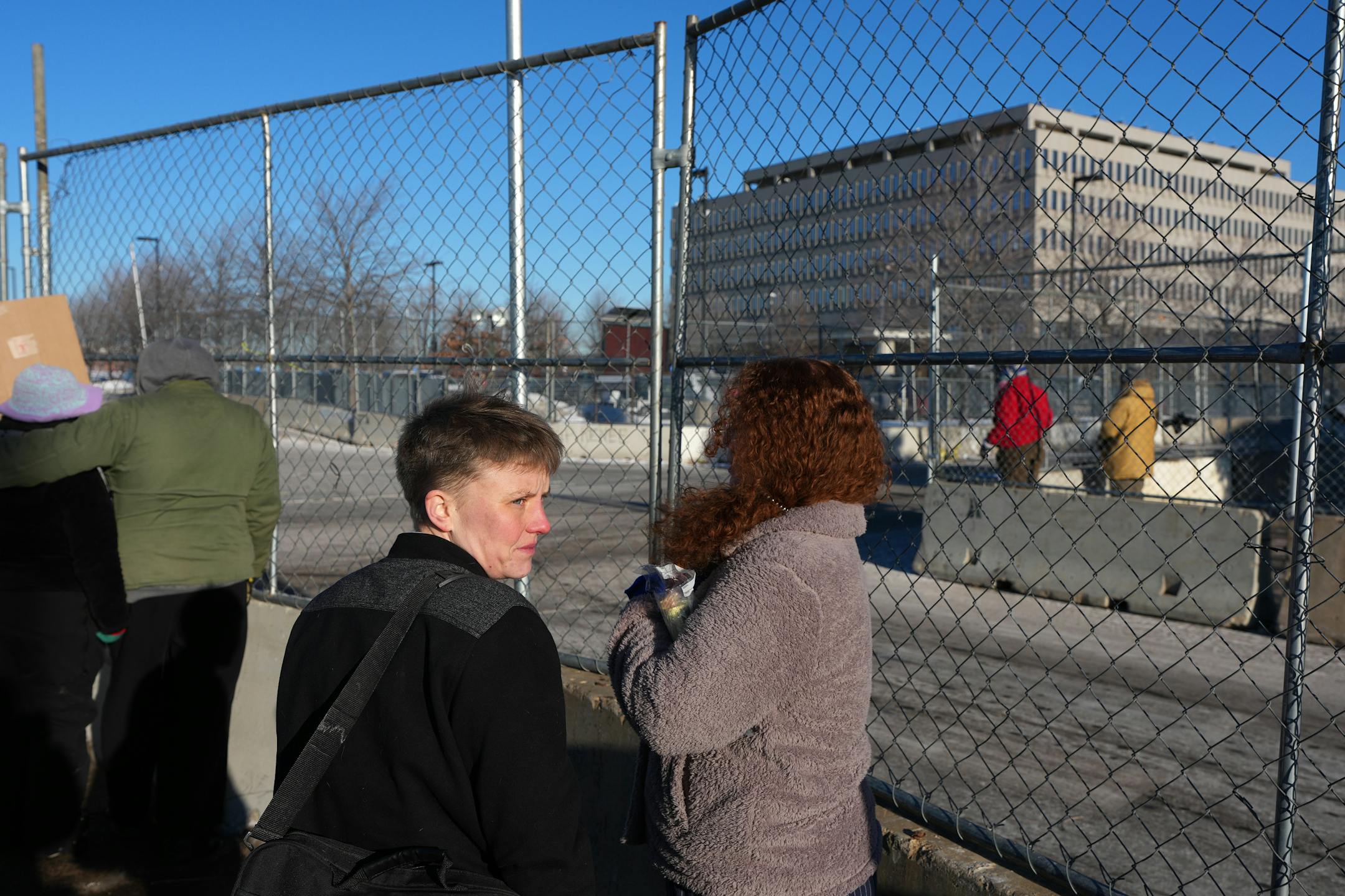 Attorney Kira Kelley, who helps clients who have been ordered released by a federal judge but who are still in custody, talks with a friend outside the Whipple Federal Building on Jan. 28, where immigration court is held. (Anthony Souffle/The Minnesota Star Tribune)