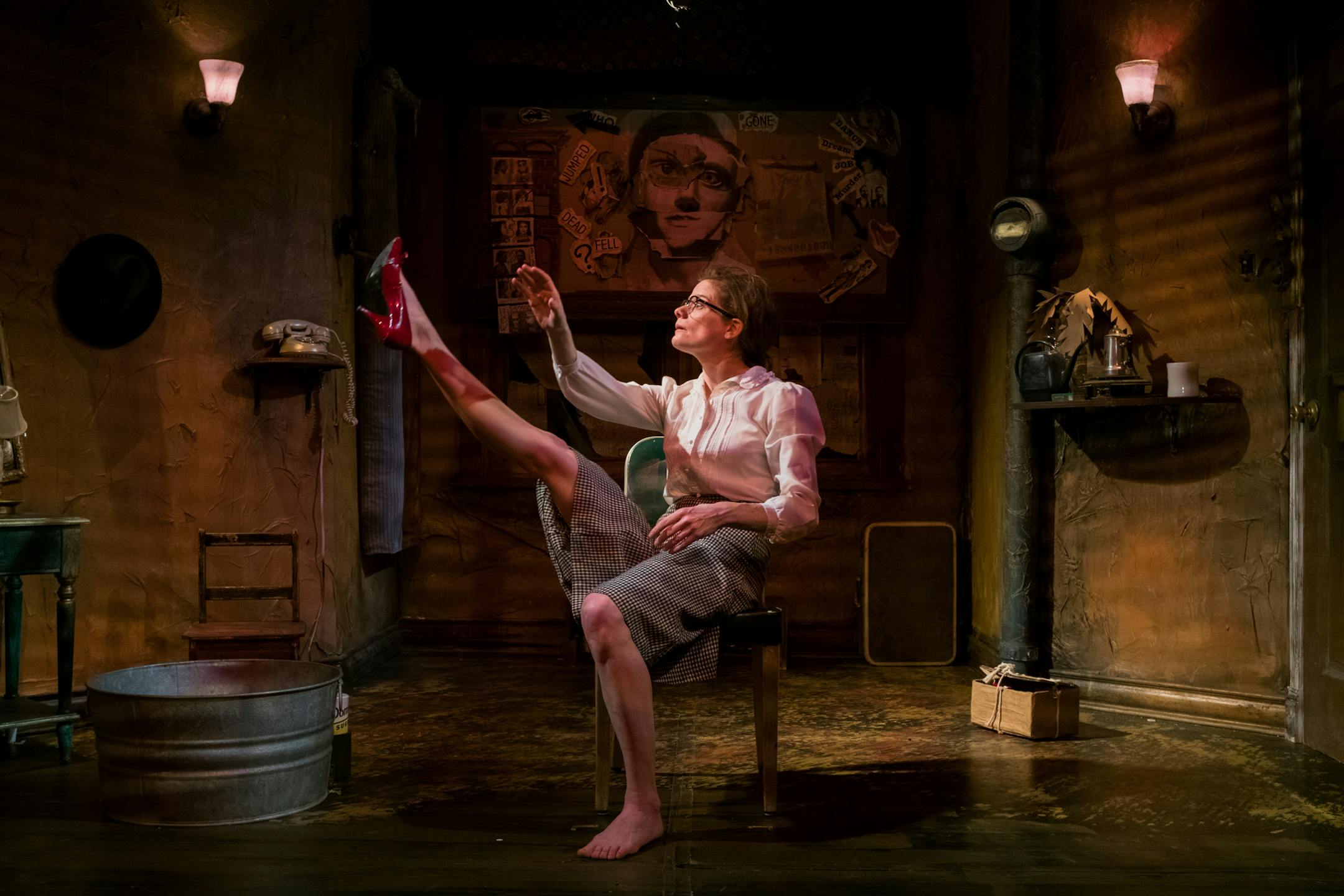 Joel Sass conceived, directed and co-wrote (with Richardson) "Red Shoes" with a keen sense of audience delight. His shabby set is full of corners for us to explore, including a pull-down "investigation board" on which Mouse scrawls clues. And a huge part of the fun of "Red Shoes" is in between our ears, as we try to figure out how Richardson changes so quickly from one costume into the next or how she and Sass make it look like there are two of her on stage at once (a trio of unseen performers has something to do with that).