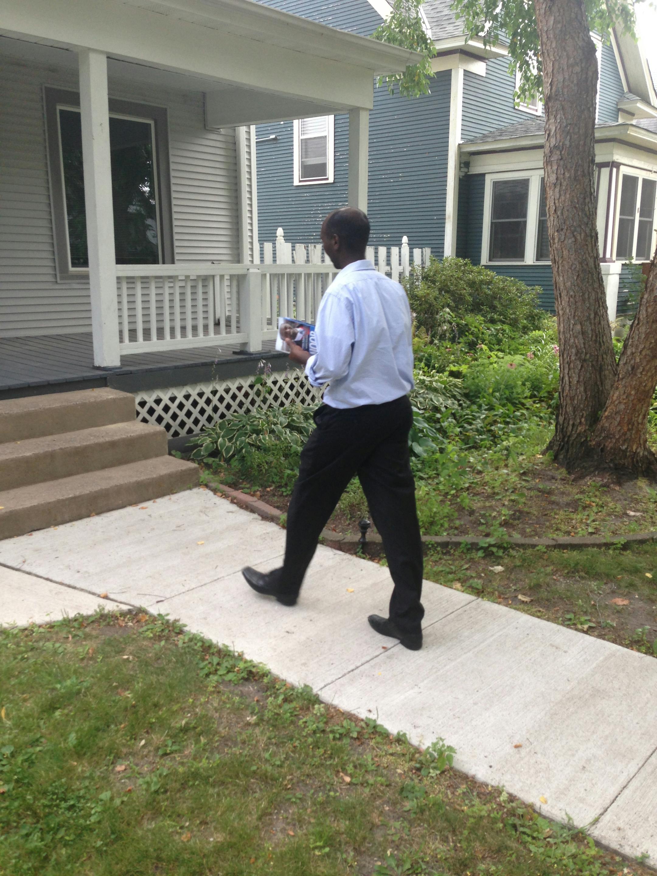 "Hi there .. My name is Mohamud Noor," he says, walking right up to the voter sitting outside.