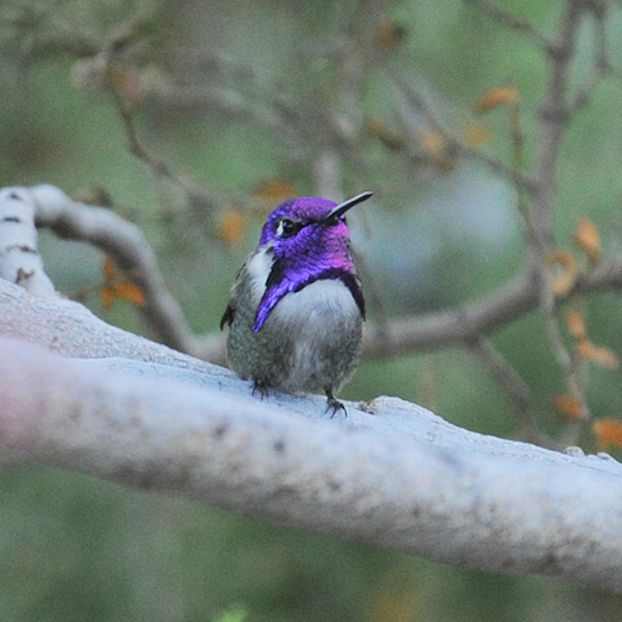 We spent the Christmas holiday in Palm Springs, California. Within the city limits lies a portion of the Agua Caliente Indian Reservation. Several thousand acres of reservation land include several canyons. Three are accessible by car. They were a six-minute drive from our inn. The desert brushland leading to the canyons also offers good birding. It was nothing like the spectacle at the top of the third canyon, however. There, a small store had four hummingbird feeders in place just outside its door. Costa's Hummingbird winters in that area. Costa's is North America's smallest hummingbird, and certainly one its most beautiful. We watched dozens of these birds feeding at the store late one afternoon. Here's a photo of a male Costa's. This was a holiday highlight.