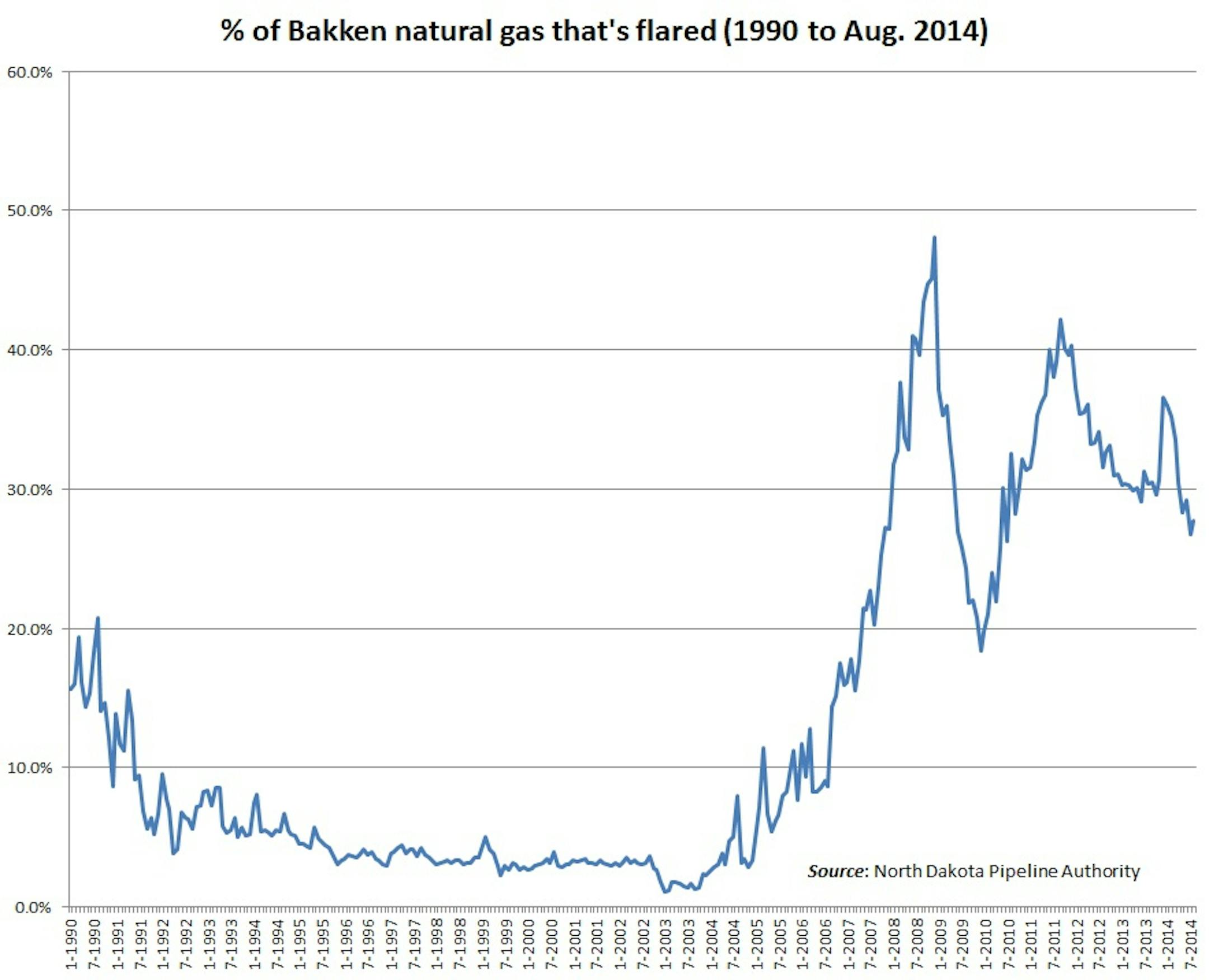 North Dakota still doesn't have quite the capacity to process all the natural gas that comes out of the ground, but as a share of all natural gas production, North Dakota and the oil industry have been making progress against flaring. They're now flaring 27.7 percent of what comes out of the ground – still more than the goal of 26 percent by the fourth quarter of 2014, but you can see improvement over the past few years.