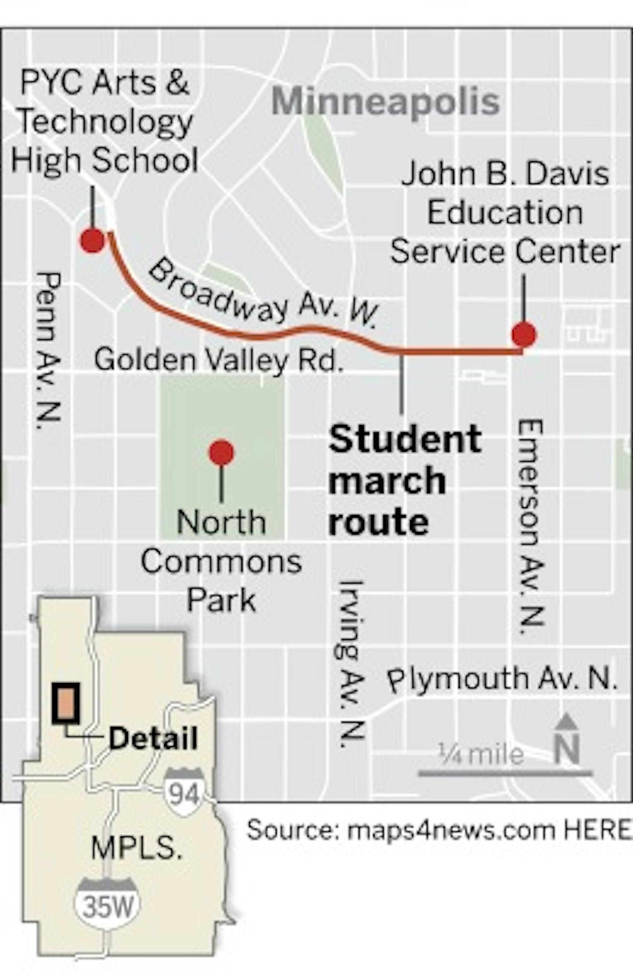 Nearly 50 students and staff from the alternative high school in north Minneapolis marched to Minneapolis School District headquarters, chanting and carrying signs that read "The climate is changing, why aren't we?" and "Green jobs not jails."