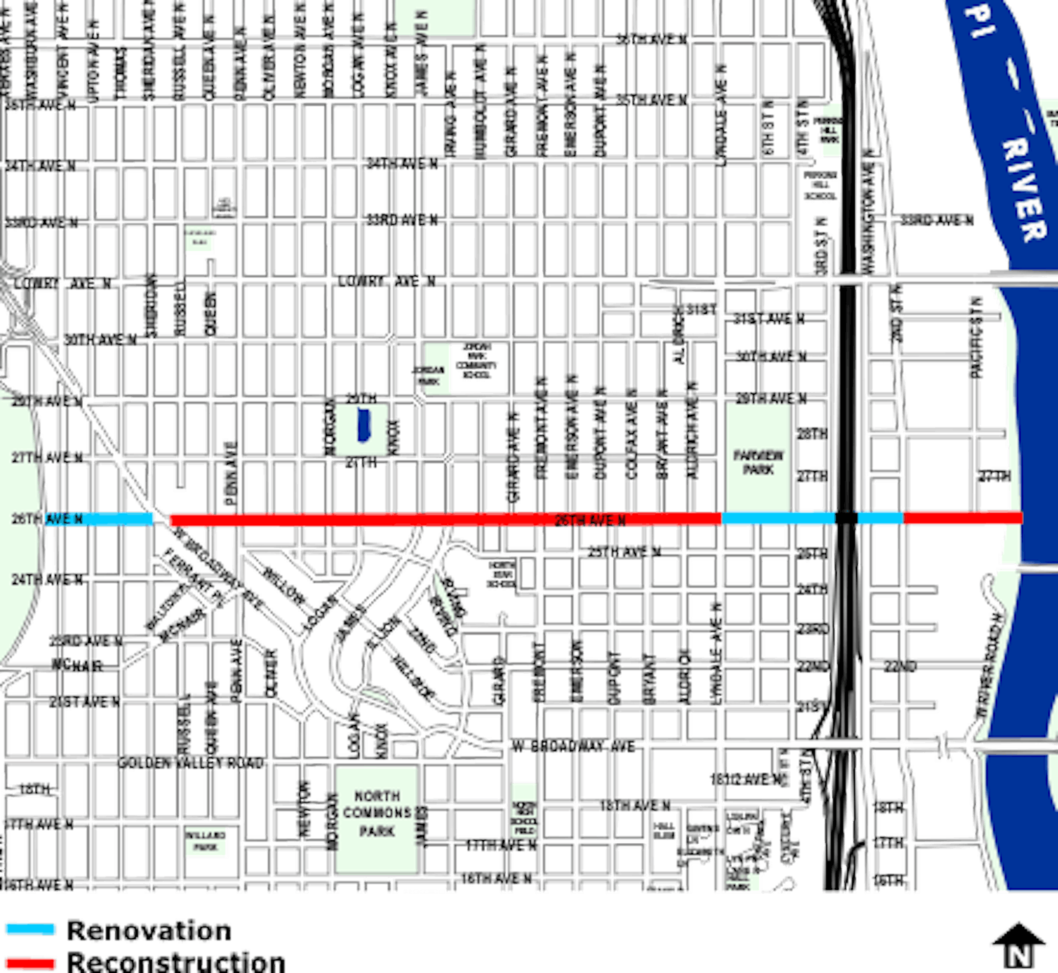 Plans approved this week by the City Council's Transportation and Public Works Committee divide the project into two phases. This year's work will start in the summer, and renovate the street between Wirth and W. Broadway Avenue, and also between Lyndale Avenue and N. 2nd St. That portion will be ground down extensively and repaved. The midsection of the route between Broadway and Lyndale, and also a short portion from 2nd to the river will get a more thorough reconstruction next year. Both will get extensive curb and gutter replacements, Handeland said, especially on the street's north side where the bike path and boulevard replace space now occupied by the street.