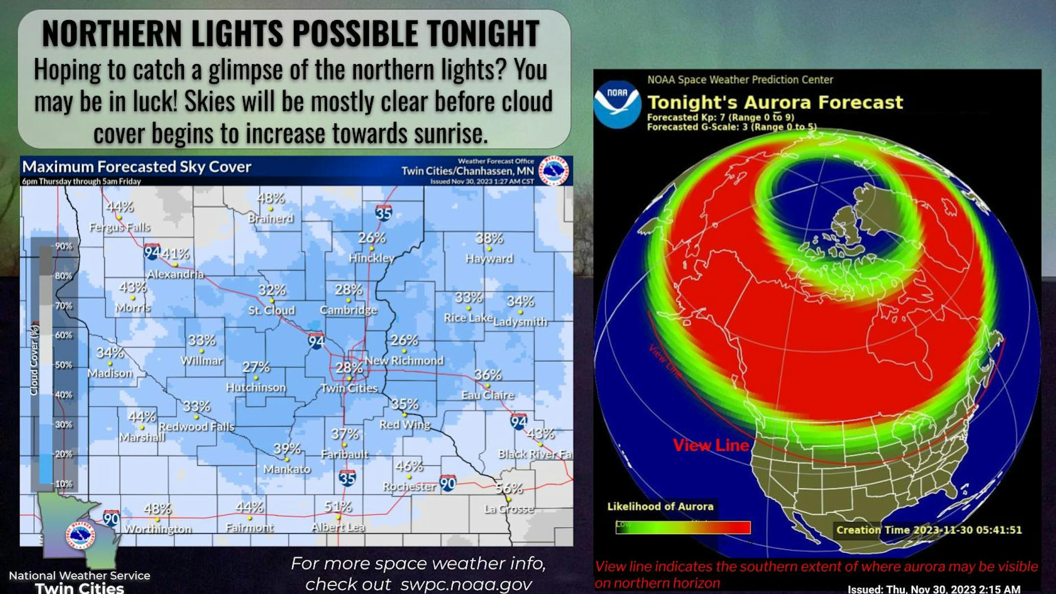 With four coronal mass ejections (CMEs) on the way to Earth Thursday into Thursday Night, the northern lights are expected to shine as we head through Thursday Night in the skies above Minnesota, with potential viewing chances into parts of the central and southern United States. For many areas across central and southern Minnesota, mainly clear skies with passing clouds are expected before clouds start to increase toward Friday's sunrise.