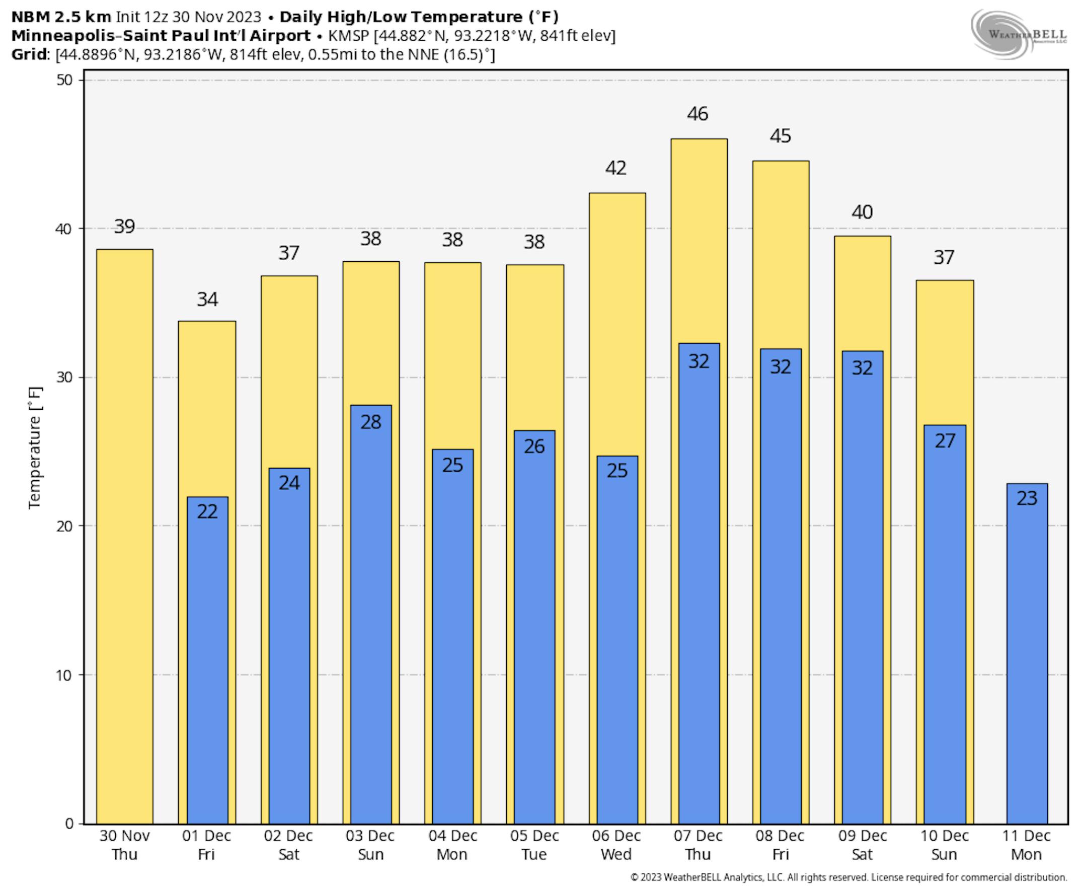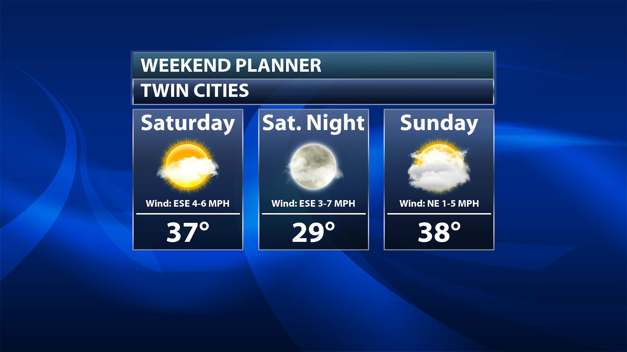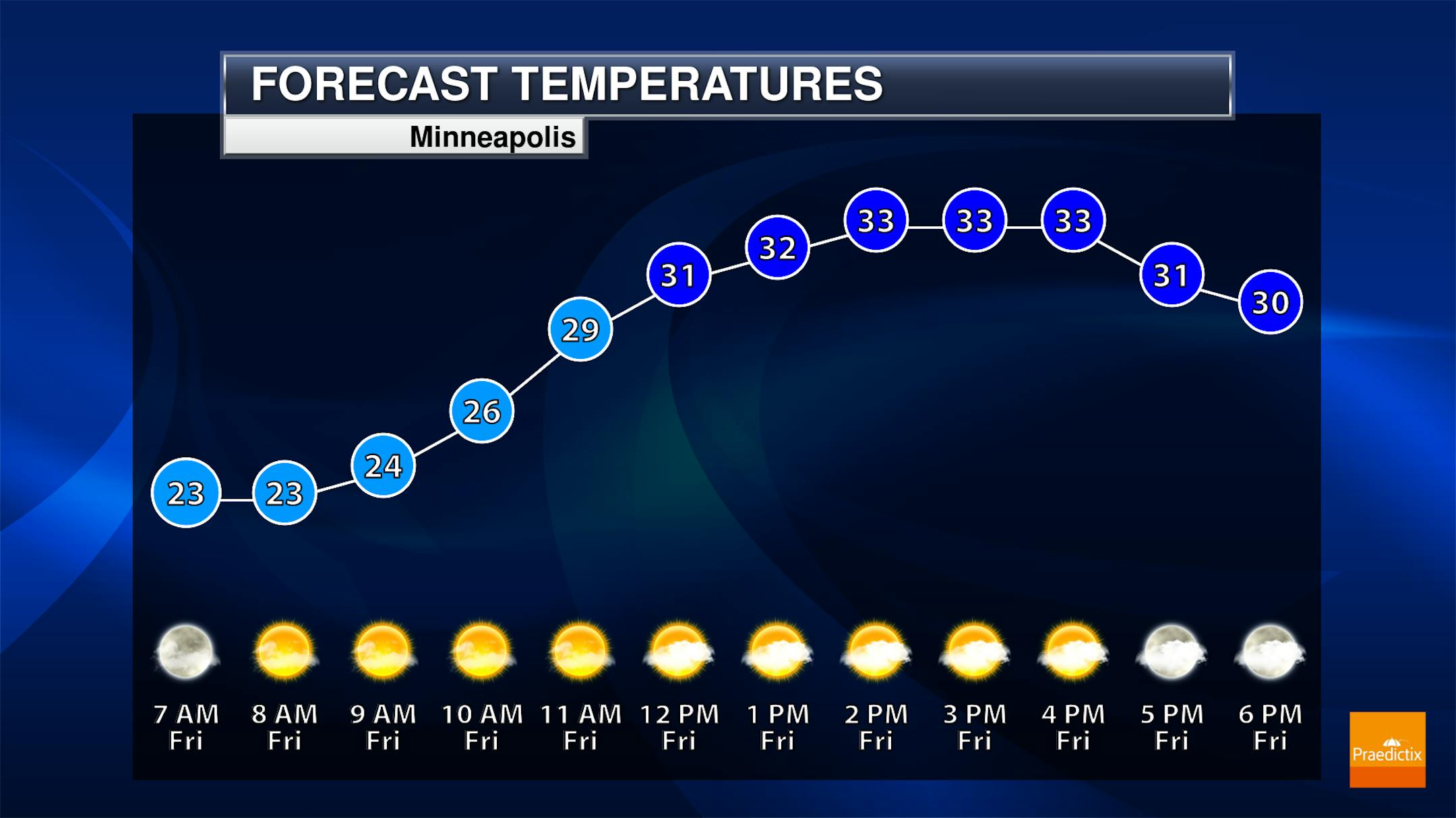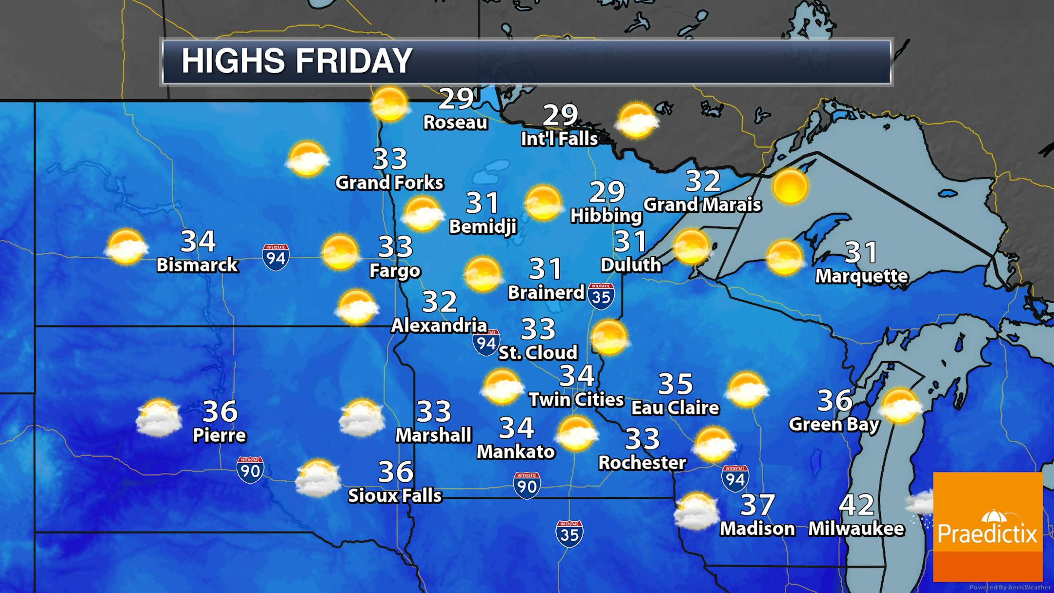 Clouds will increase throughout the day across the state, with highs ranging from the upper 20s in northern Minnesota to the mid-30s in southern Minnesota.