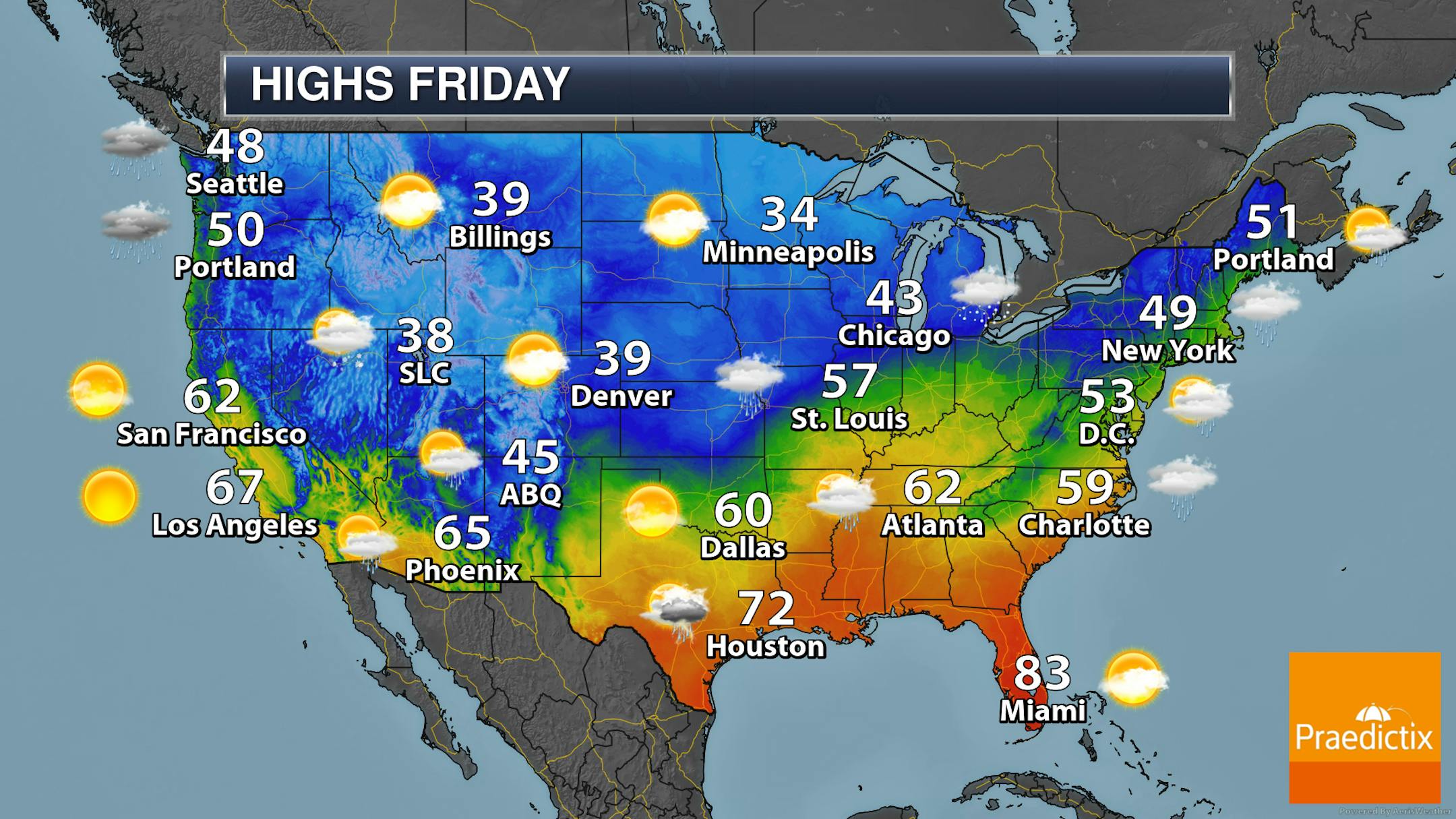 As we head into Friday in the metro, clouds will be on the increase throughout the day. Morning temperatures will start the day off in the low 20s with highs topping off in the mid-30s.