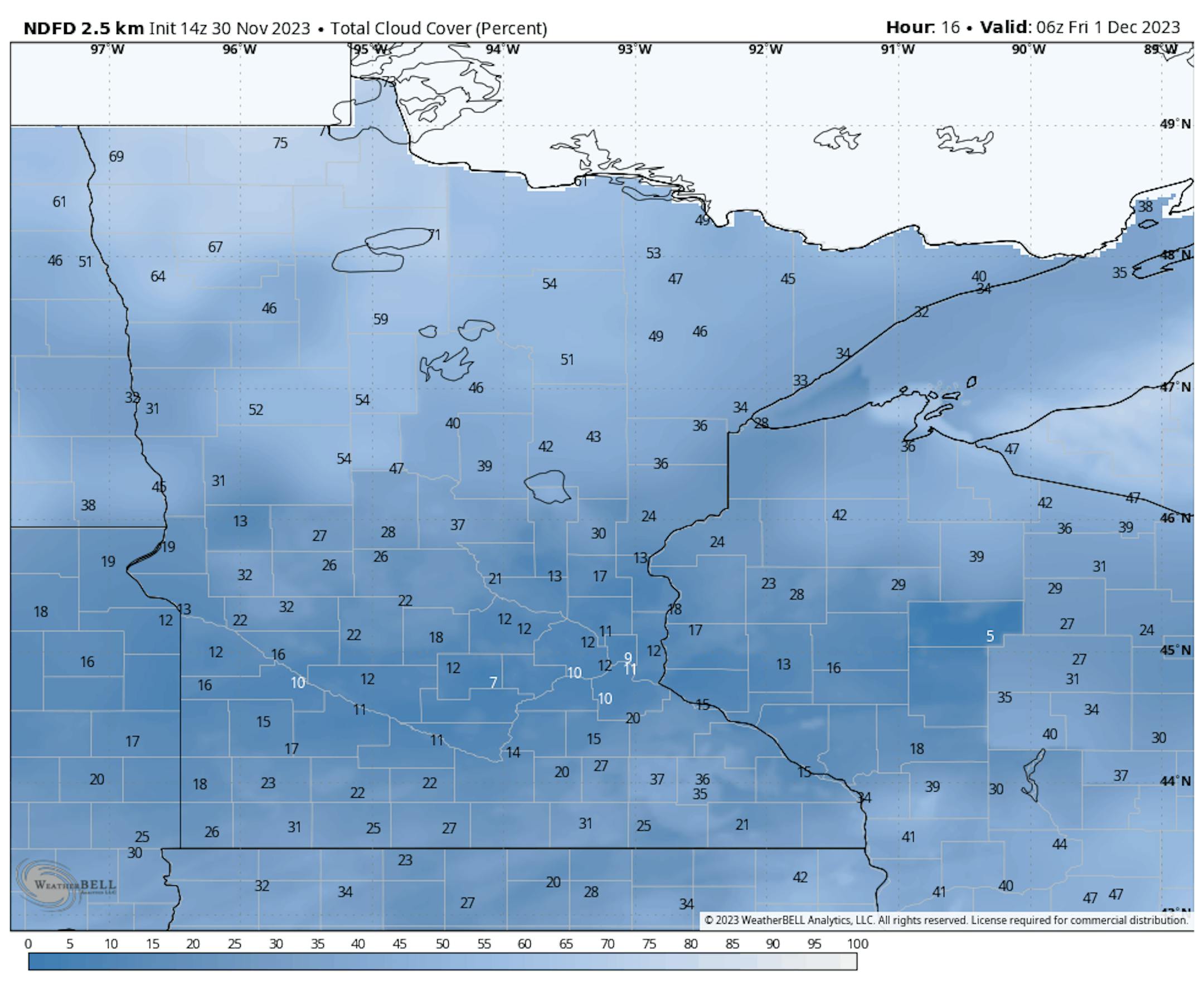 This is expected cloud cover around Midnight Thursday Night - which is when NOAA has the start of the highest KP numbers for aurora potential. Again, the best chance of clearer skies will be across central and southern Minnesota, with a few more clouds expected up north.