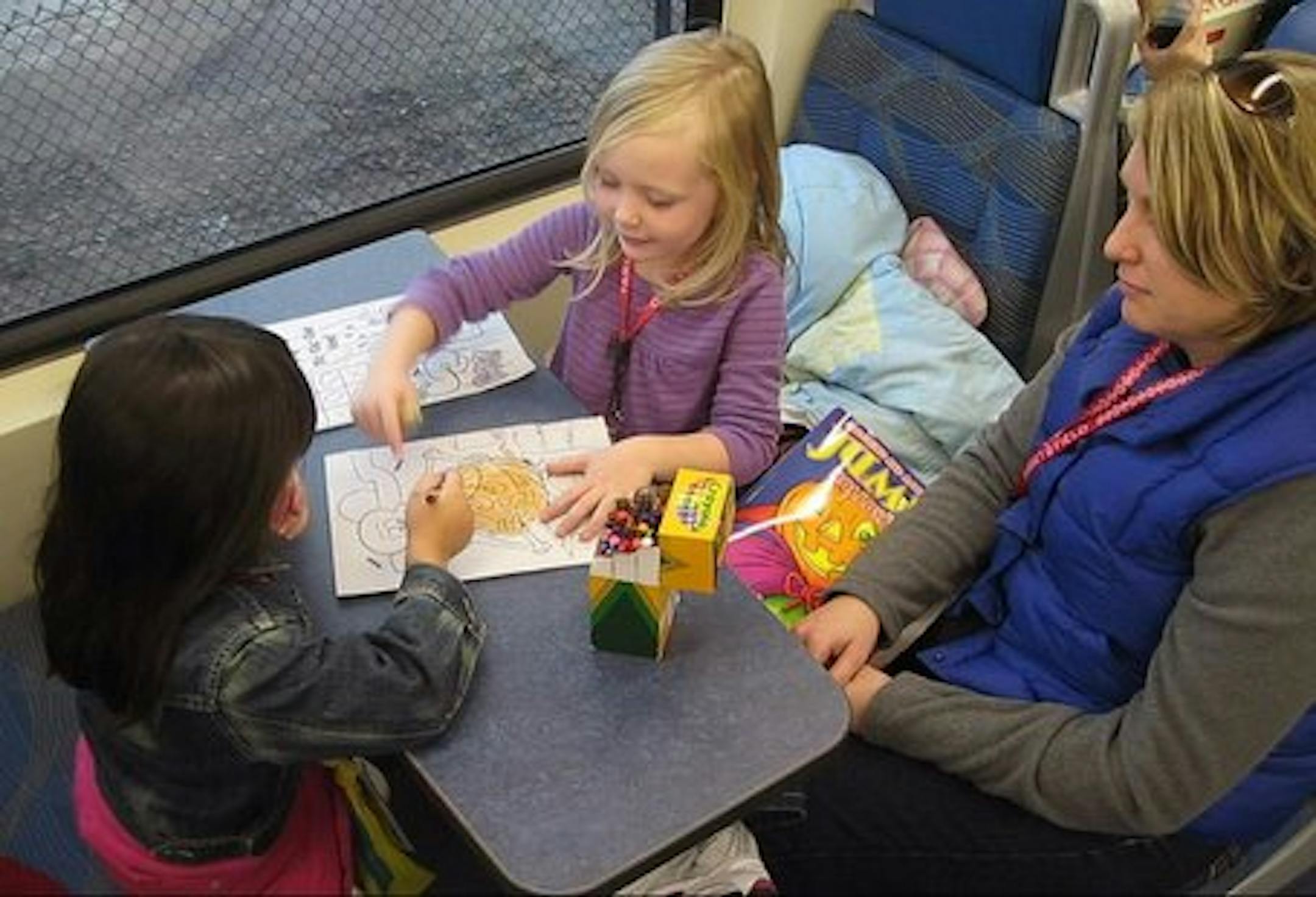 Seems unlikely that there'll be a lot of crayons on the laptop tables during rush hour, but either way, these folks knew how to make the most of the ride. (In another car, I saw a woman stuyding a book about web design.)