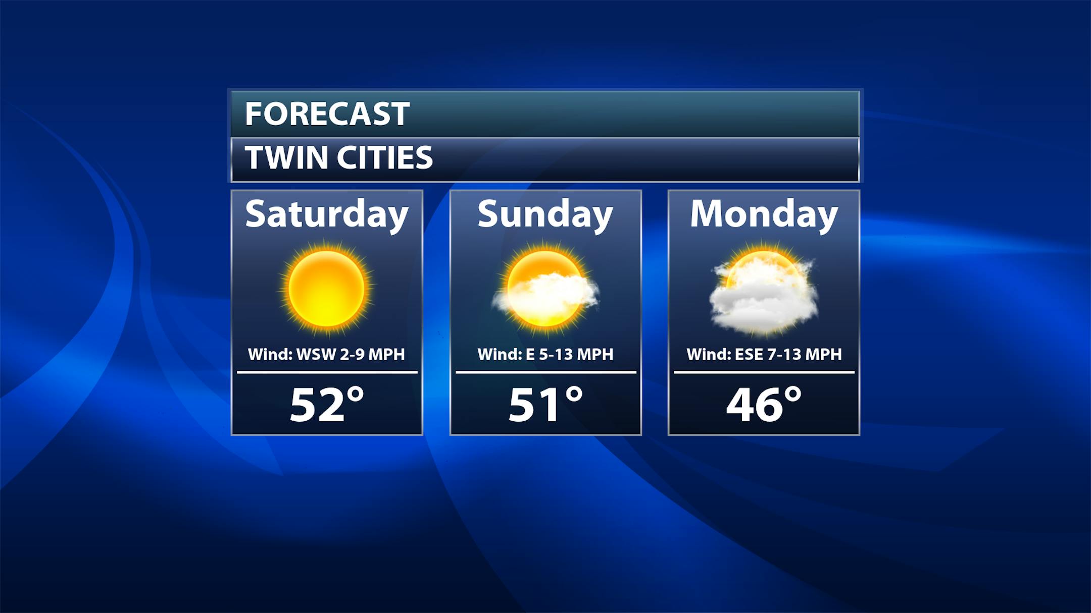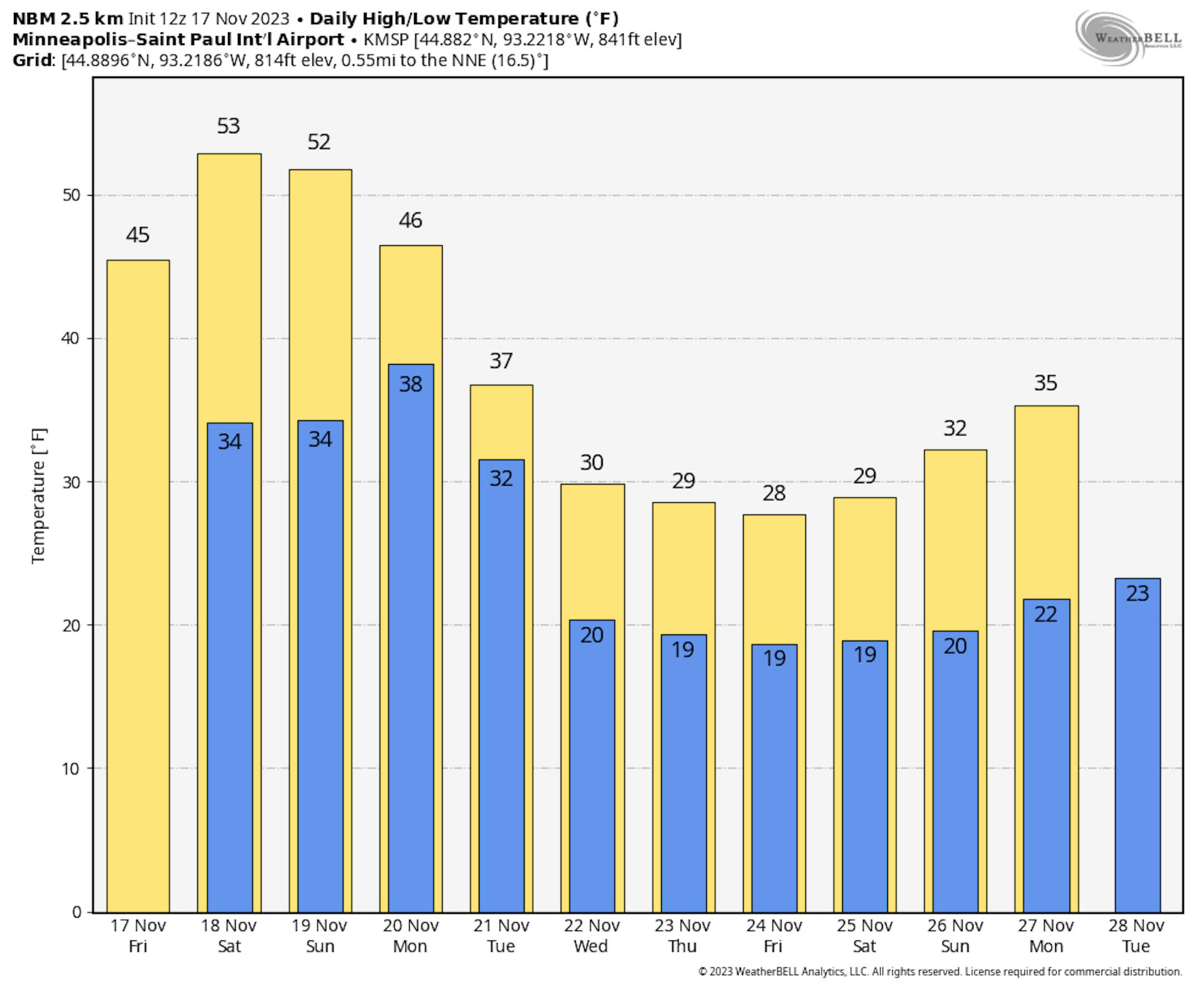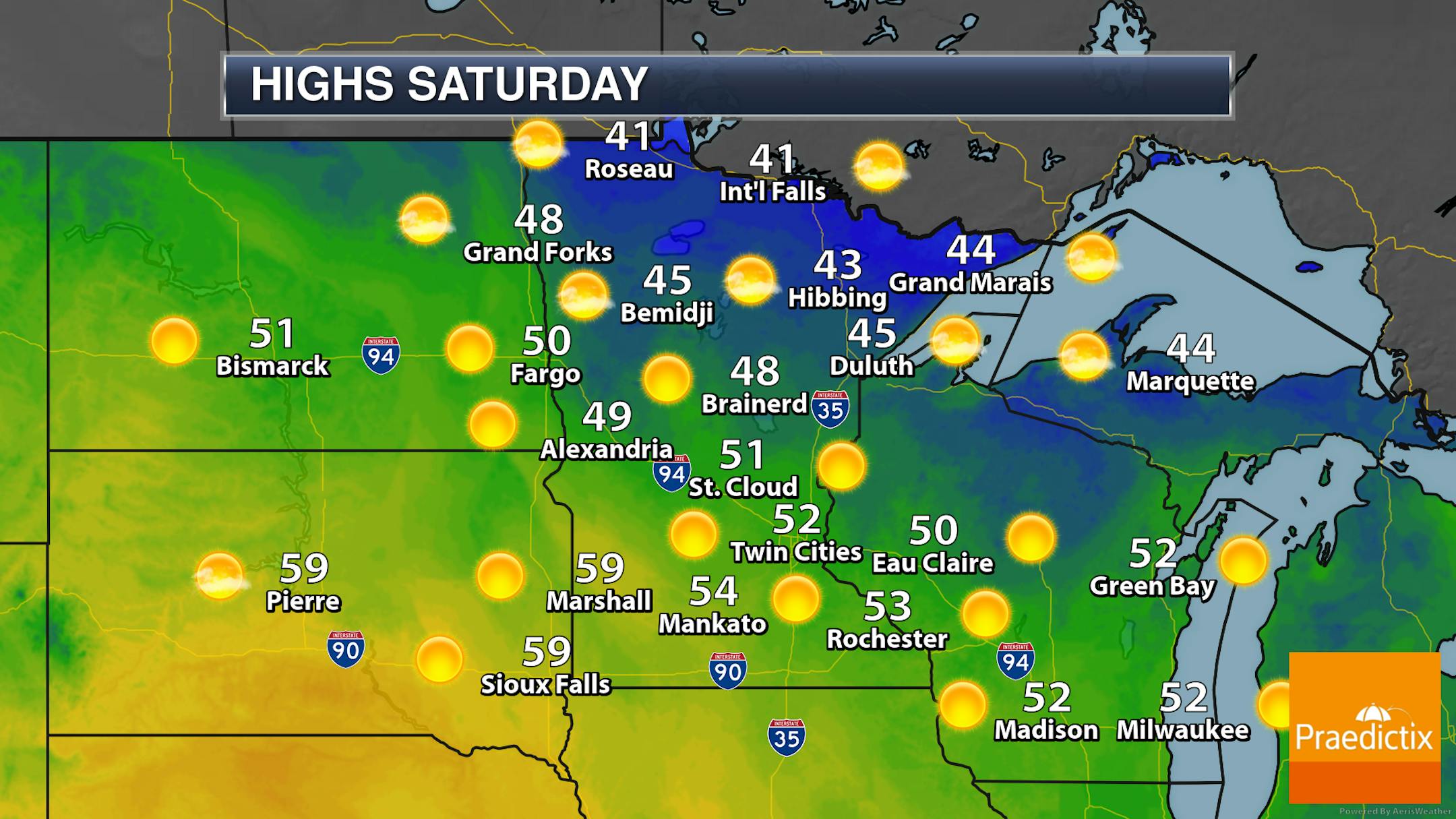 Mainly sunny skies are expected across the state on Saturday with highs ranging from the 40s up north to near 60F in southwestern Minnesota. A nice mid-November day to once again be outside!