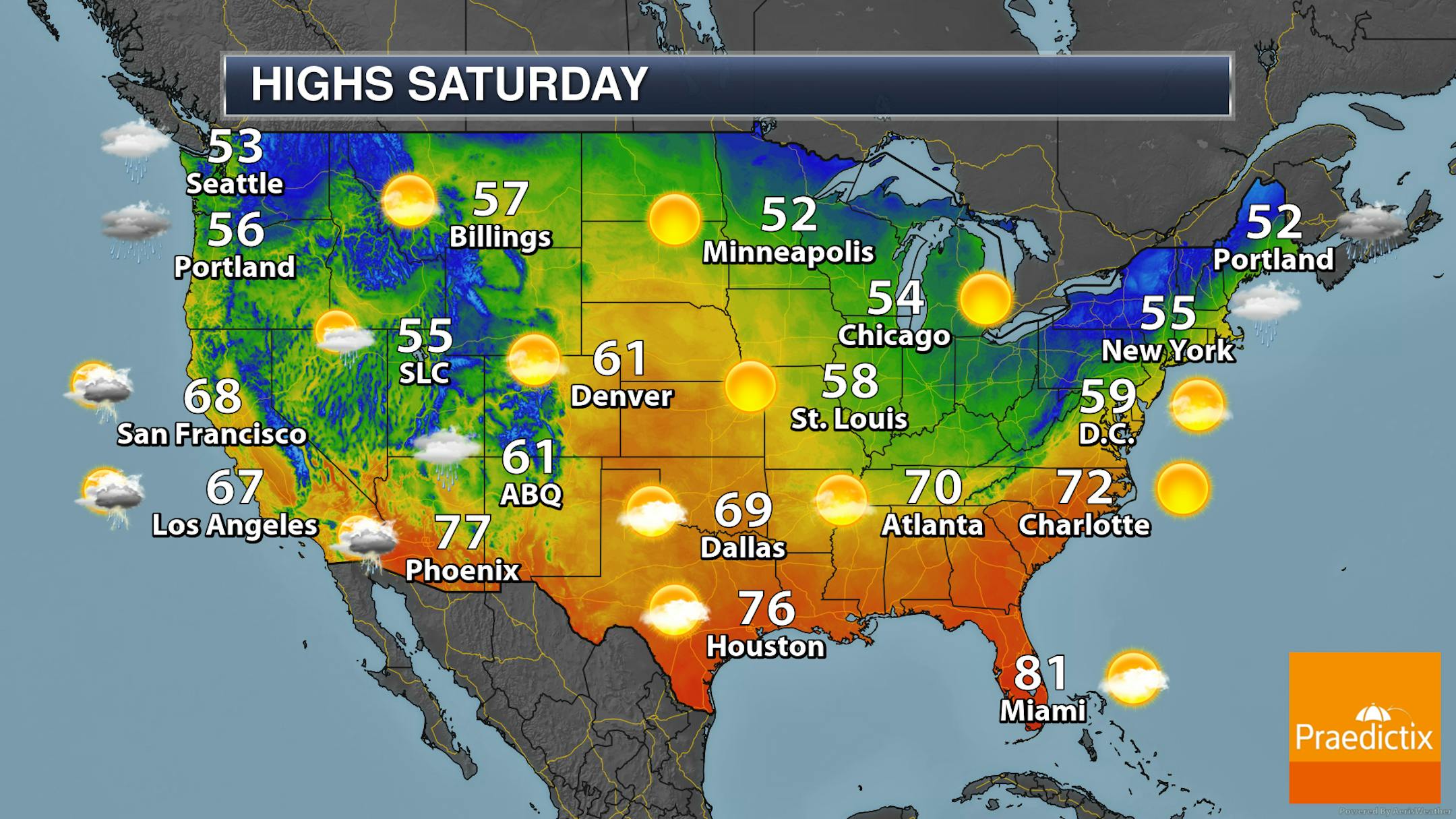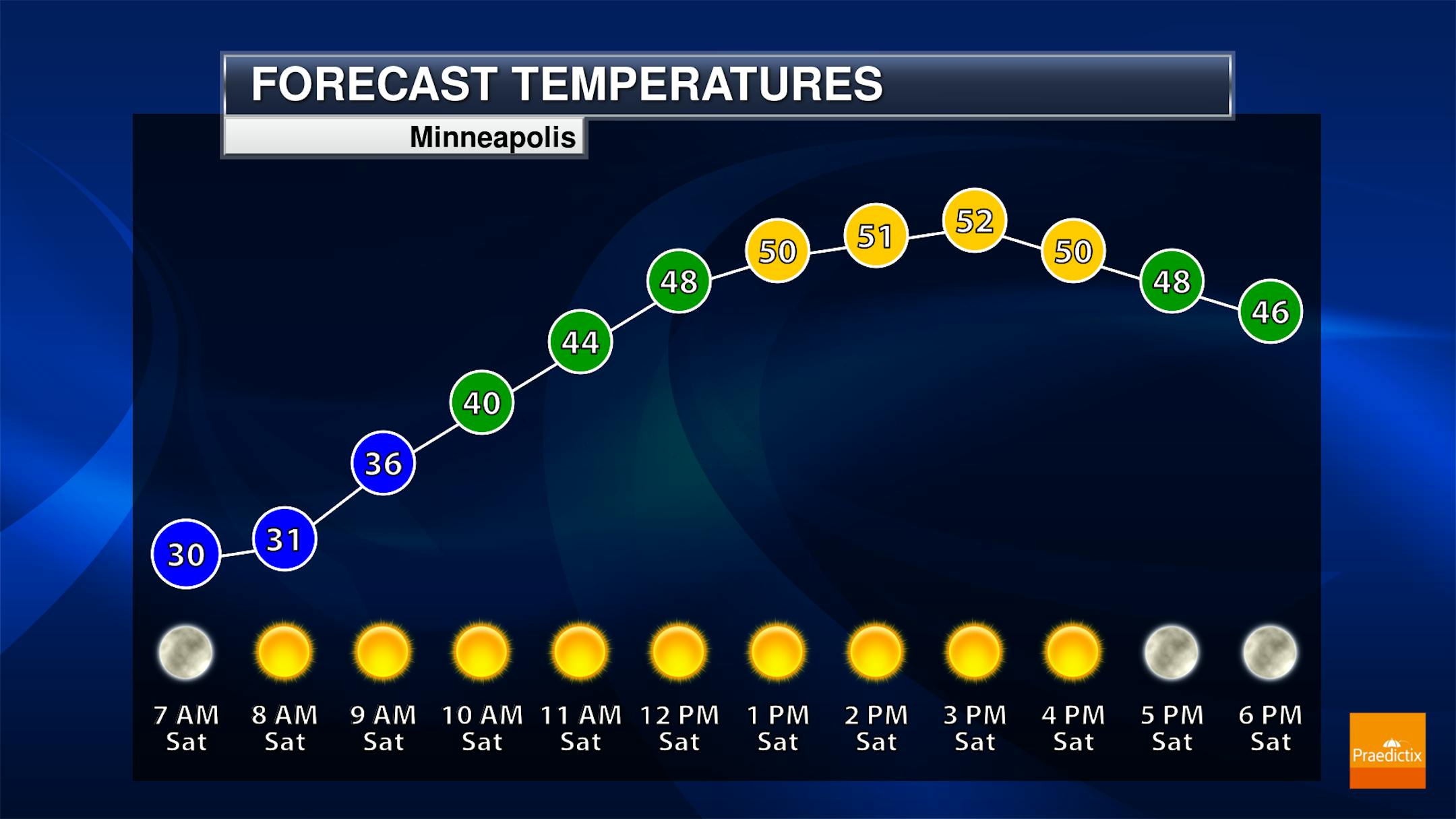 Mainly sunny conditions will dominate the skies on Saturday in the metro, with morning temperatures down around 30F and highs in the low 50s.