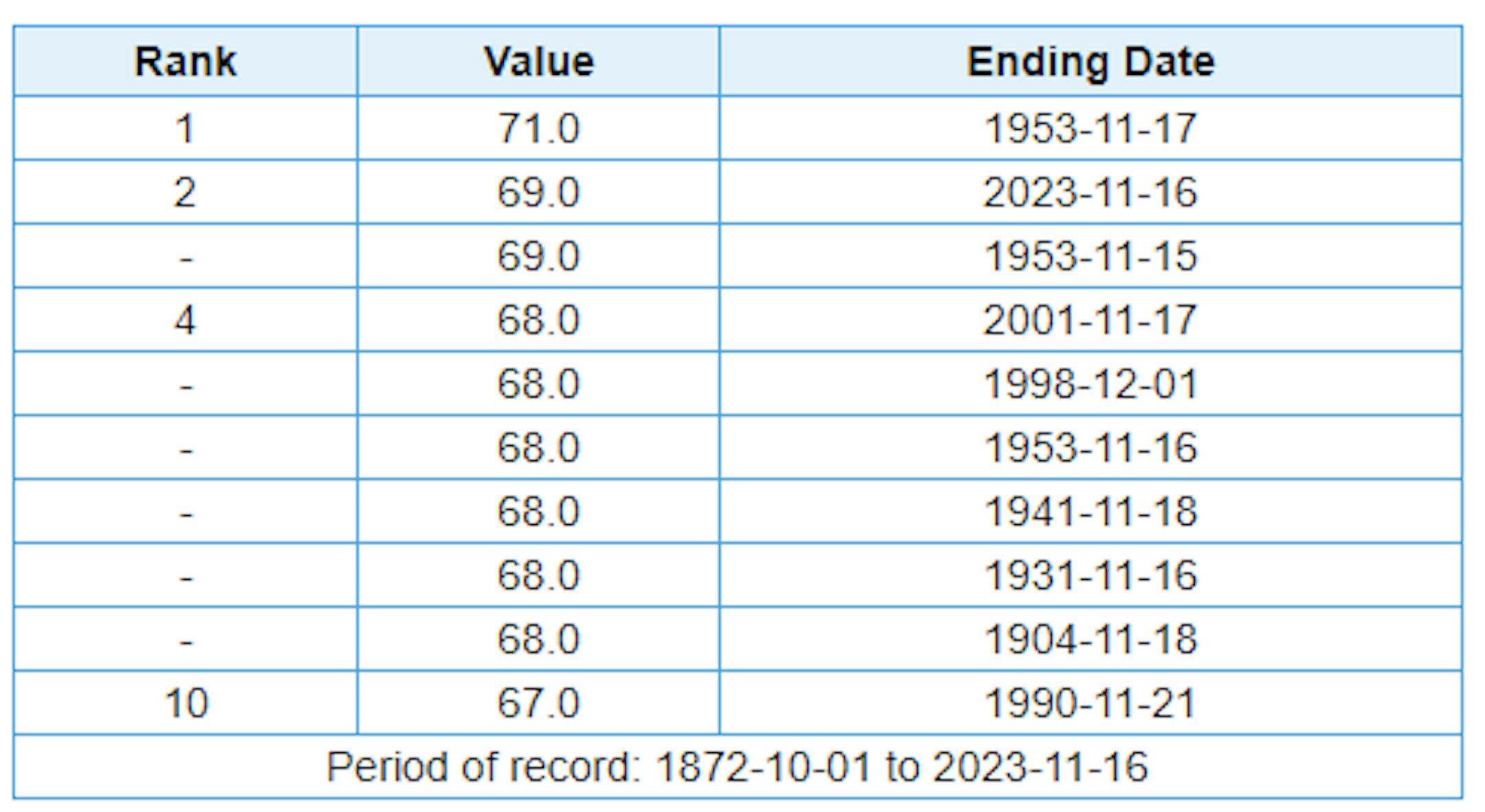 The high of 69F is tied for the 2nd warmest high on or after November 15th in the metro. The only warmer day was November 17, 1953, which reached 71F.