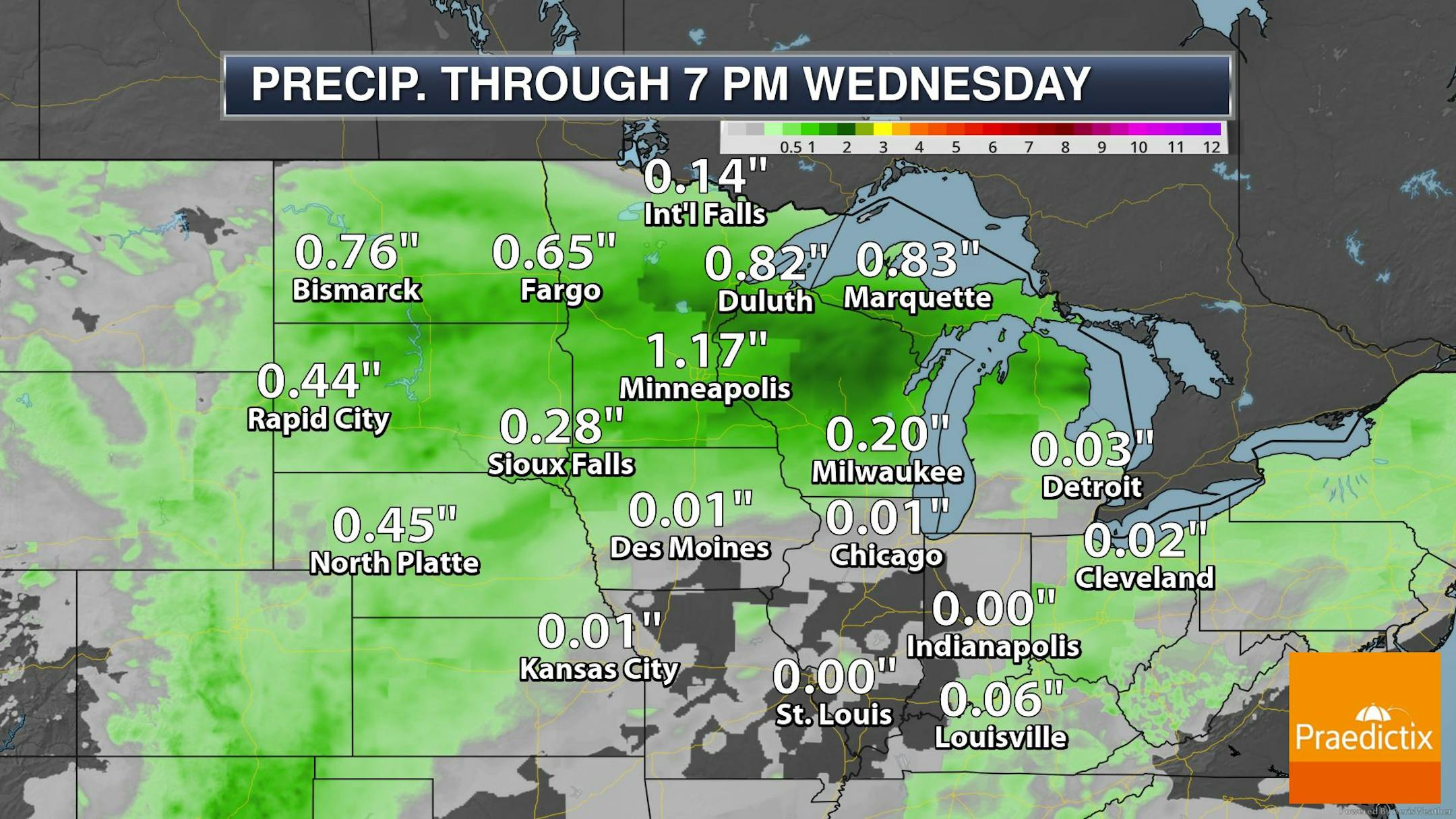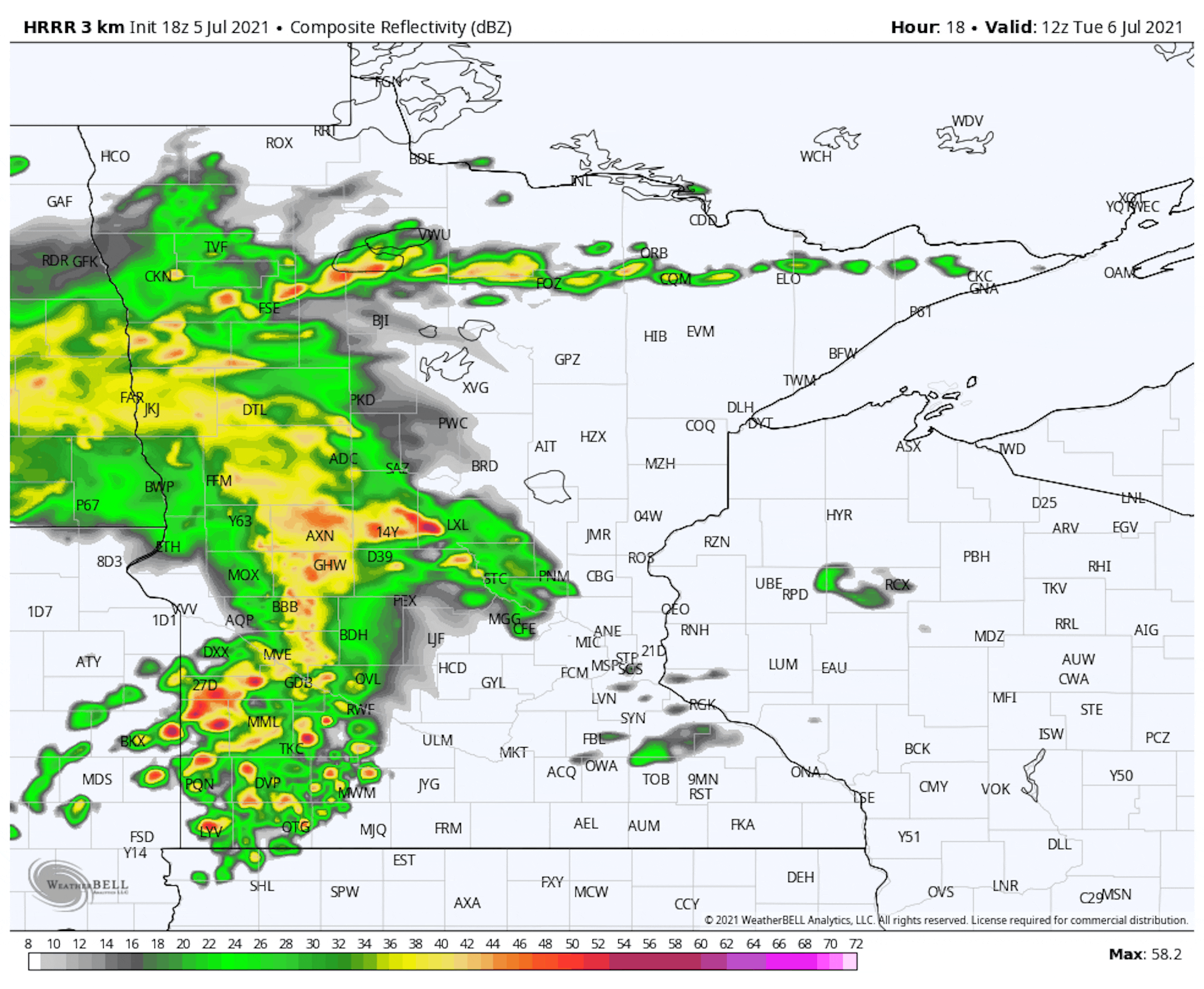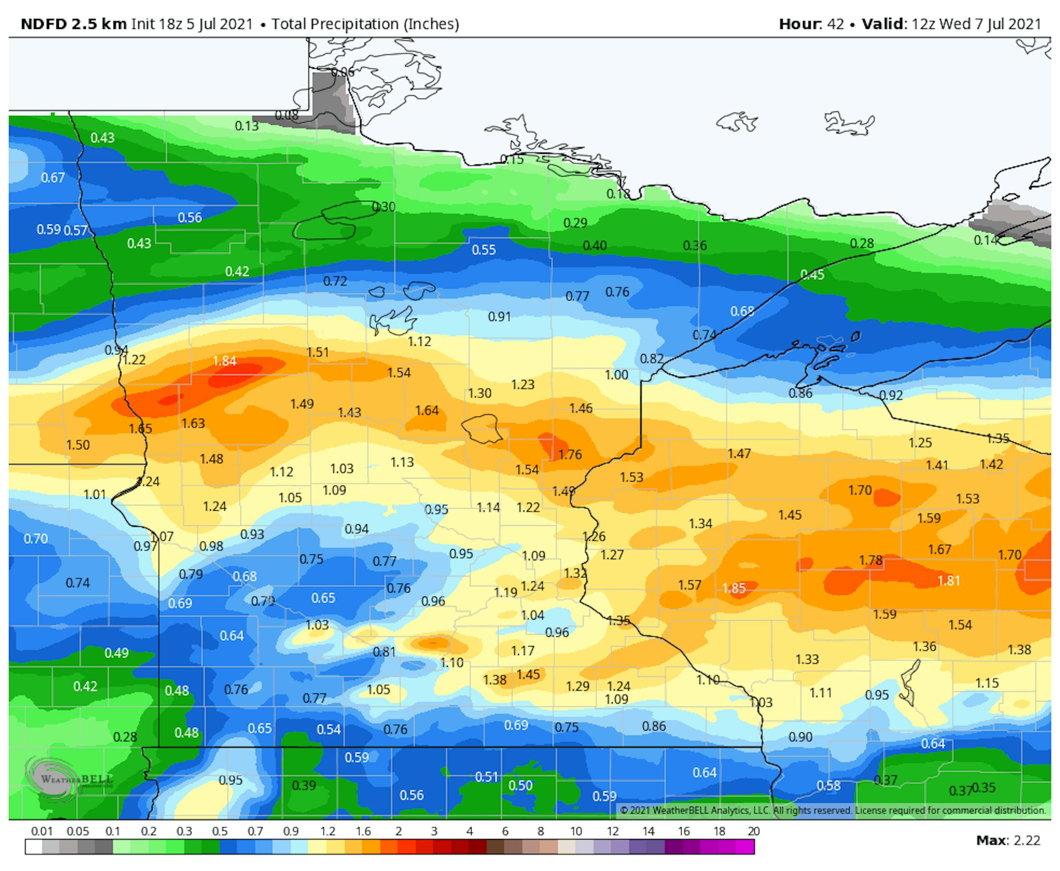 The rainfall potential through Wednesday shows fairly widespread rainfall with some locations getting up to near 1" or more, including parts of the Twin Cities. Keep in mind that many locations are dealing with big precipitation deficits so far this summer and since the beginning of the year.