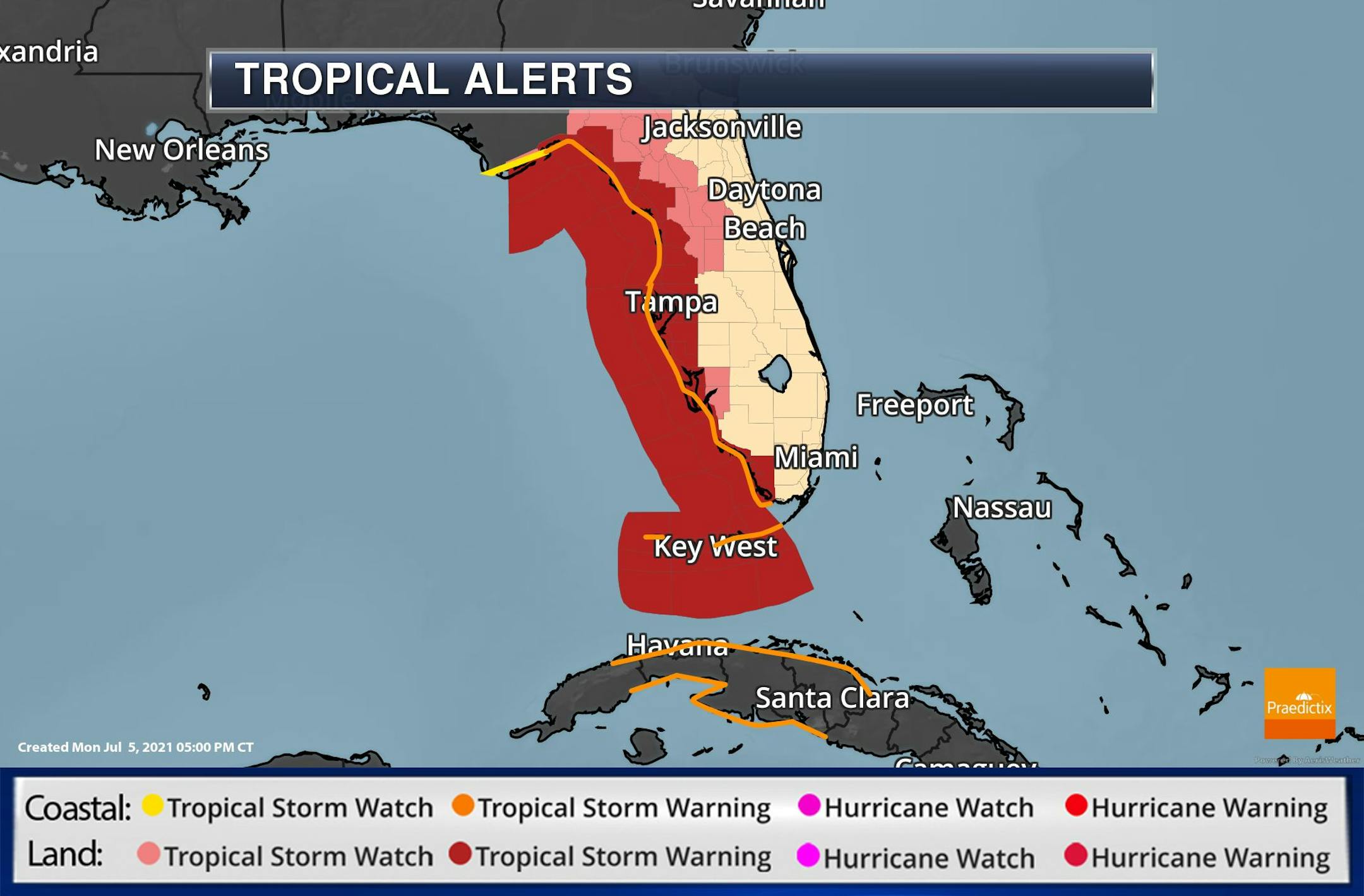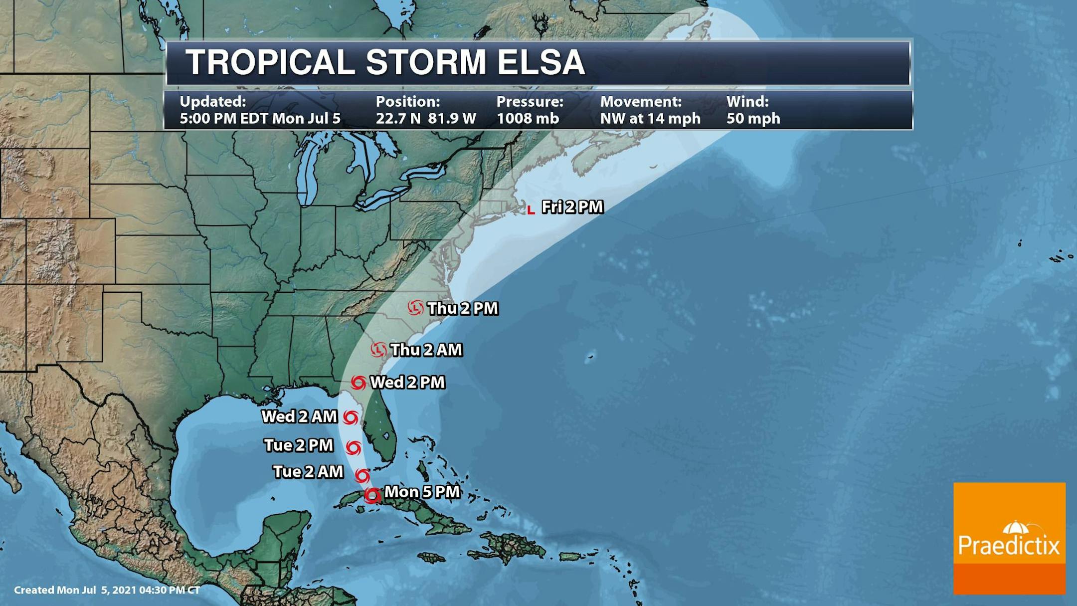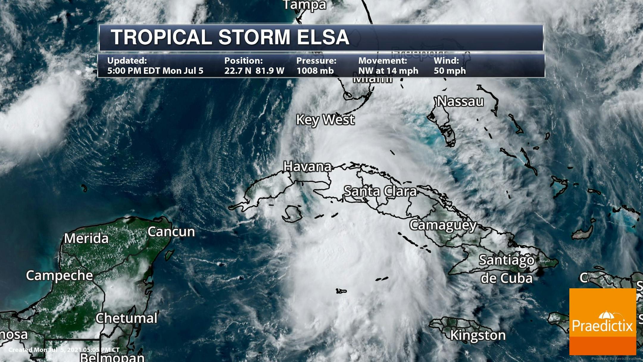 As of 5PM EDT, Elsa was a Tropical Storm with 50mph sustained winds located near Cuba and was headed NW at 14mph. Elsa became the 5th named storm of the 2021 Atlantic Hurricane on July 1st, which was the earlier on record beating the previous record set last year (2020) by Eduord on July 9th.
