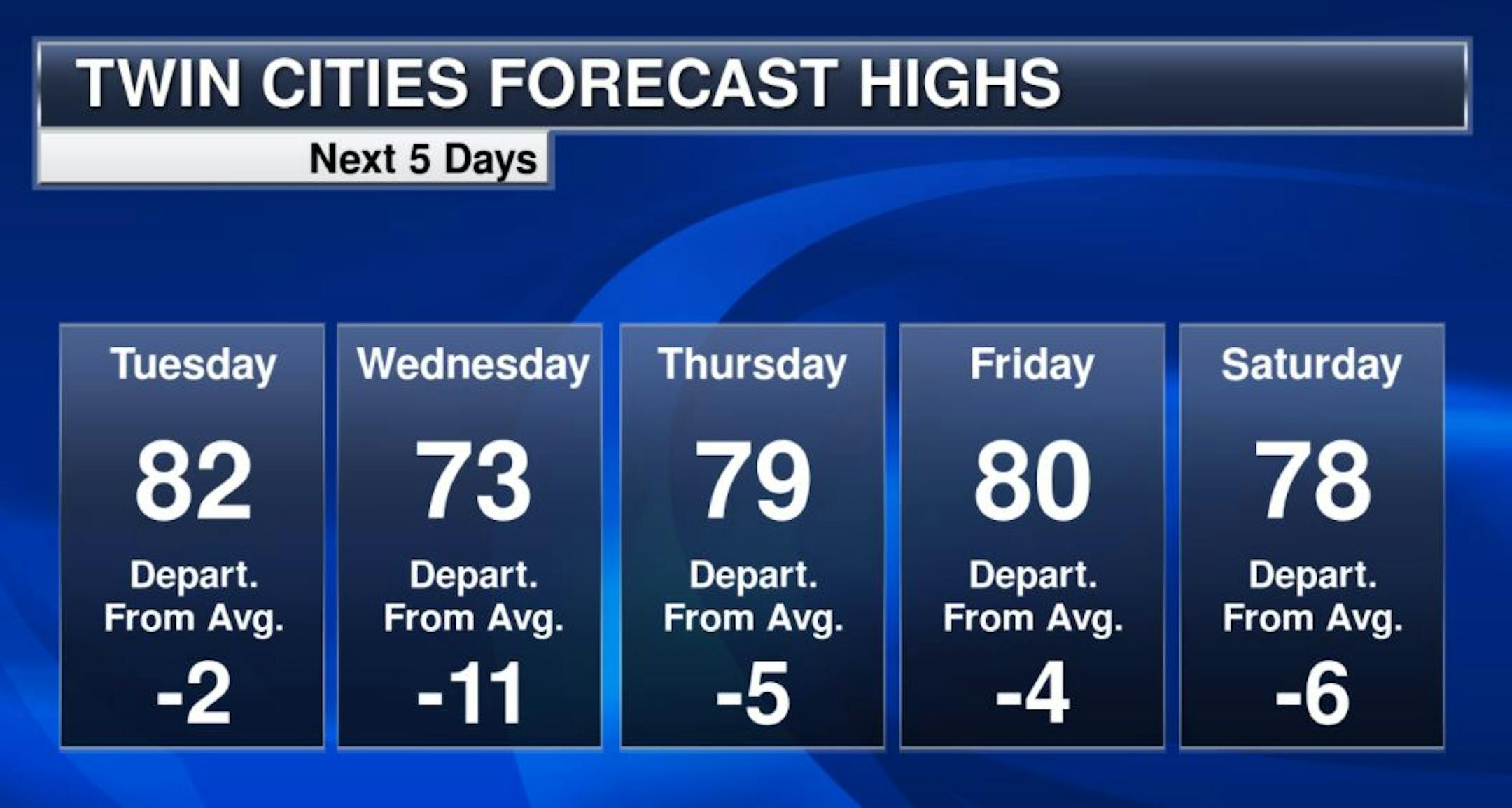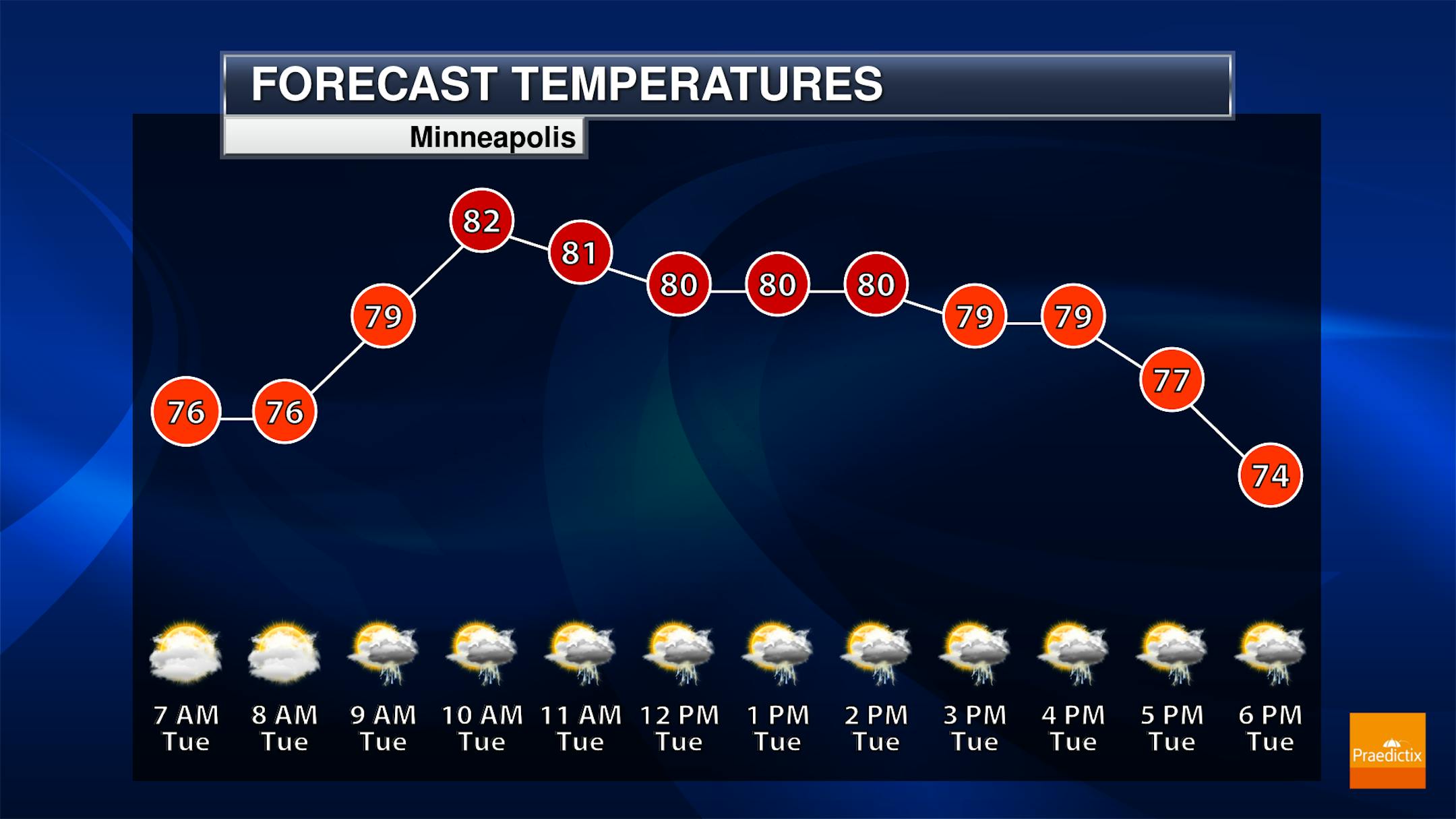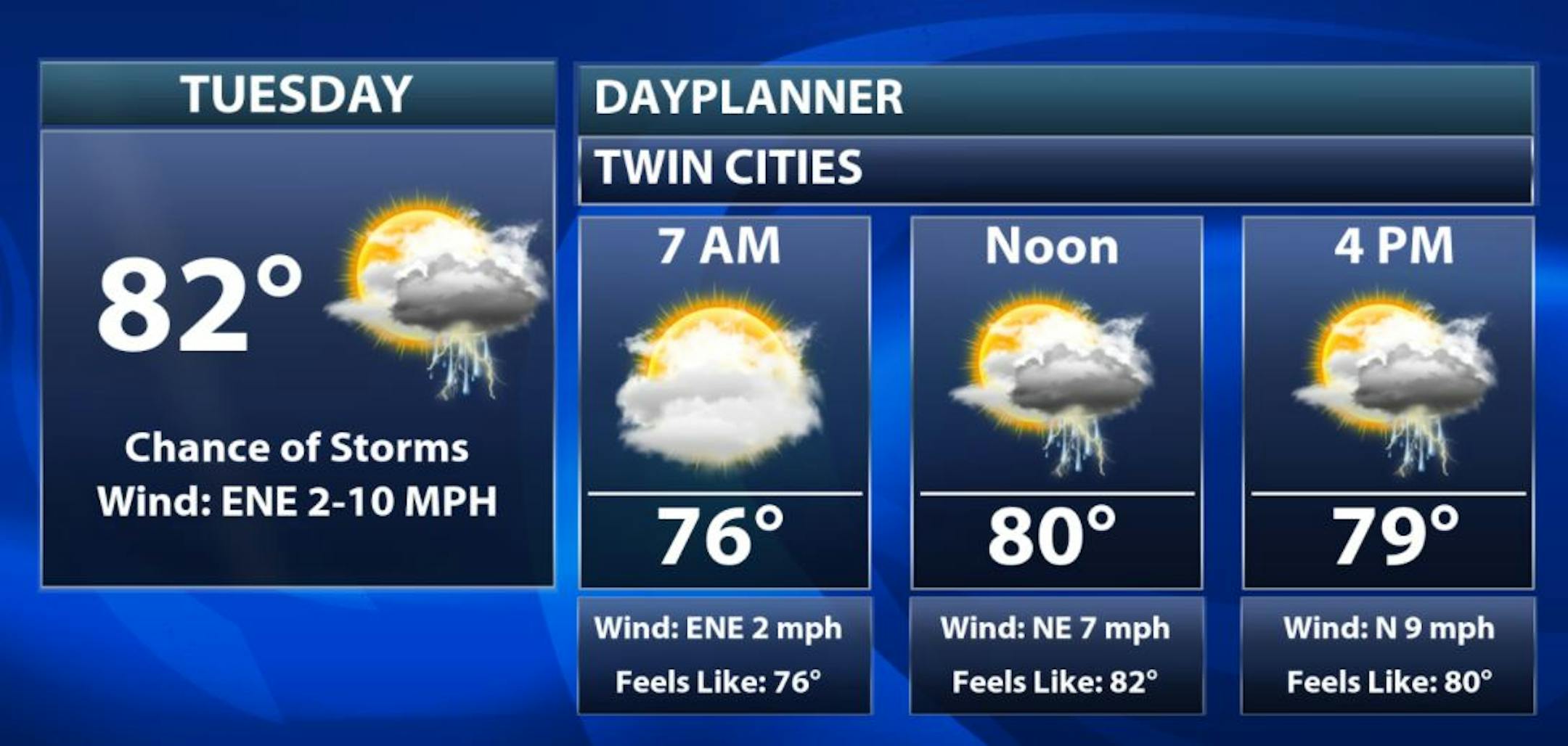 The weather outlook for the Twin Cities on Tuesday shows cooler temps in place along with a chance of showers and storms. There is a chance of storms in the mid to late morning hours with another round of more widespread showers and storms in the afternoon and evening. Some of the storms during the 2nd half of the day could be a little on the vigorous side, especially across the southern part of the state.