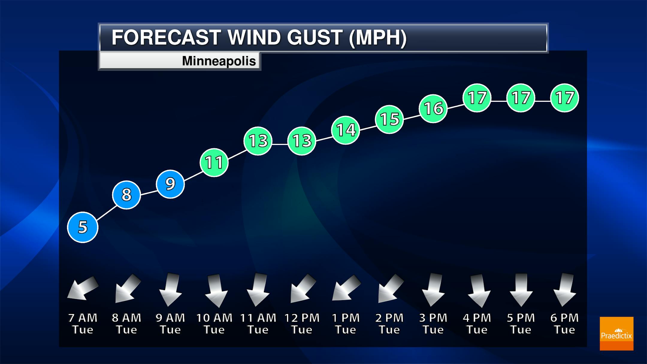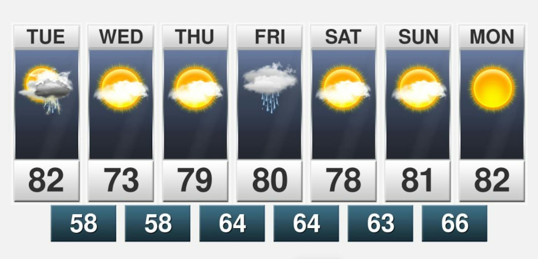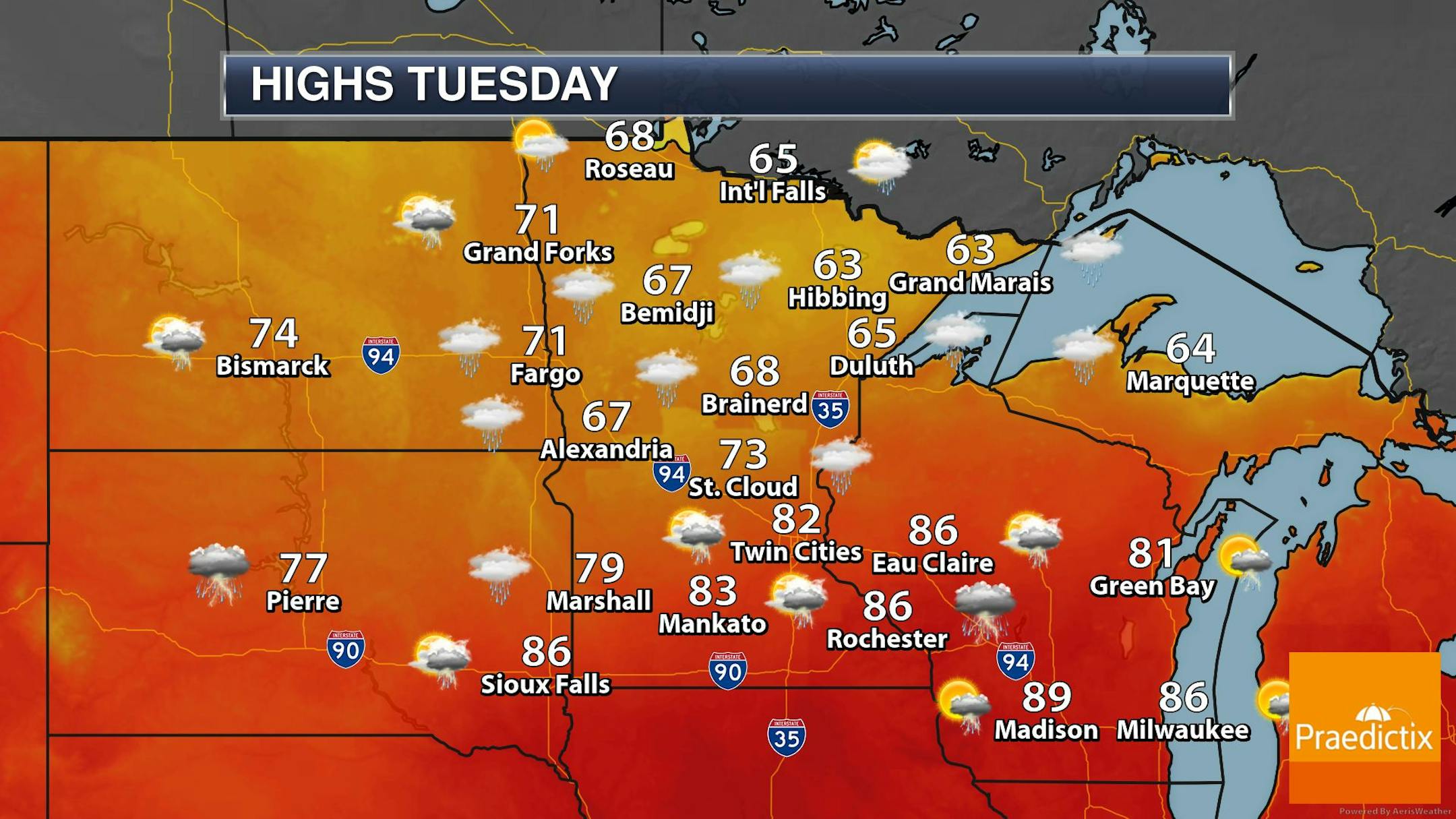 The weather outlook for the Twin Cities on Tuesday shows cooler temps in place along with a chance of showers and storms. There is a chance of storms in the mid to late morning hours with another round of more widespread showers and storms in the afternoon and evening. Some of the storms during the 2nd half of the day could be a little on the vigorous side, especially across the southern part of the state.