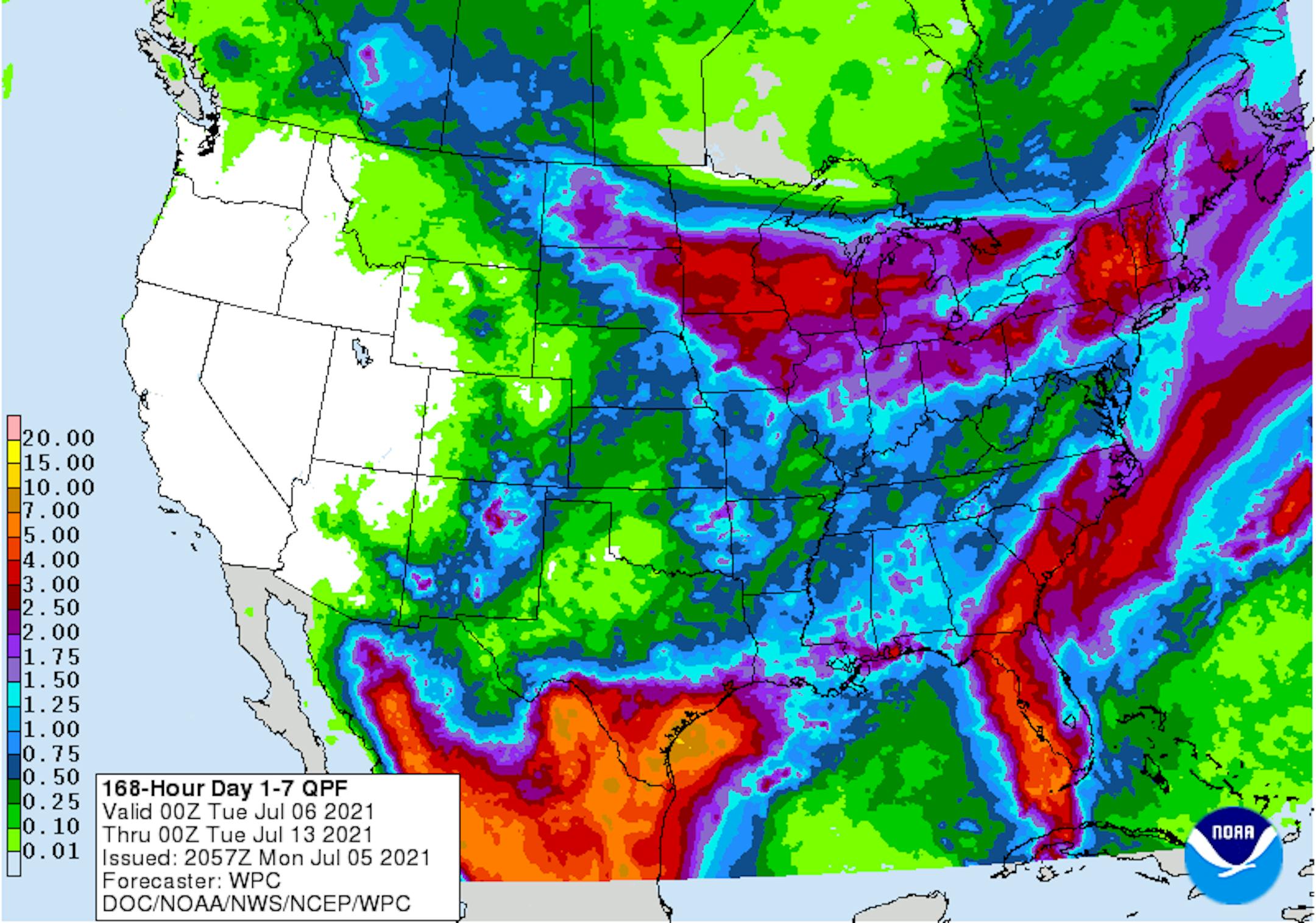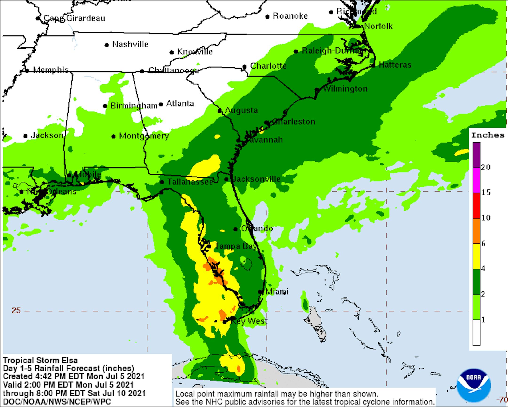 Rainfall from Elsa is expected to be quite heavy across much of Florida and especially along the West Coast, where some 6" to 10" tallies can't be ruled out. Amounts should lessen through the Mid-Atlantic States, but amounts still could approach 2" to 4" in some areas.