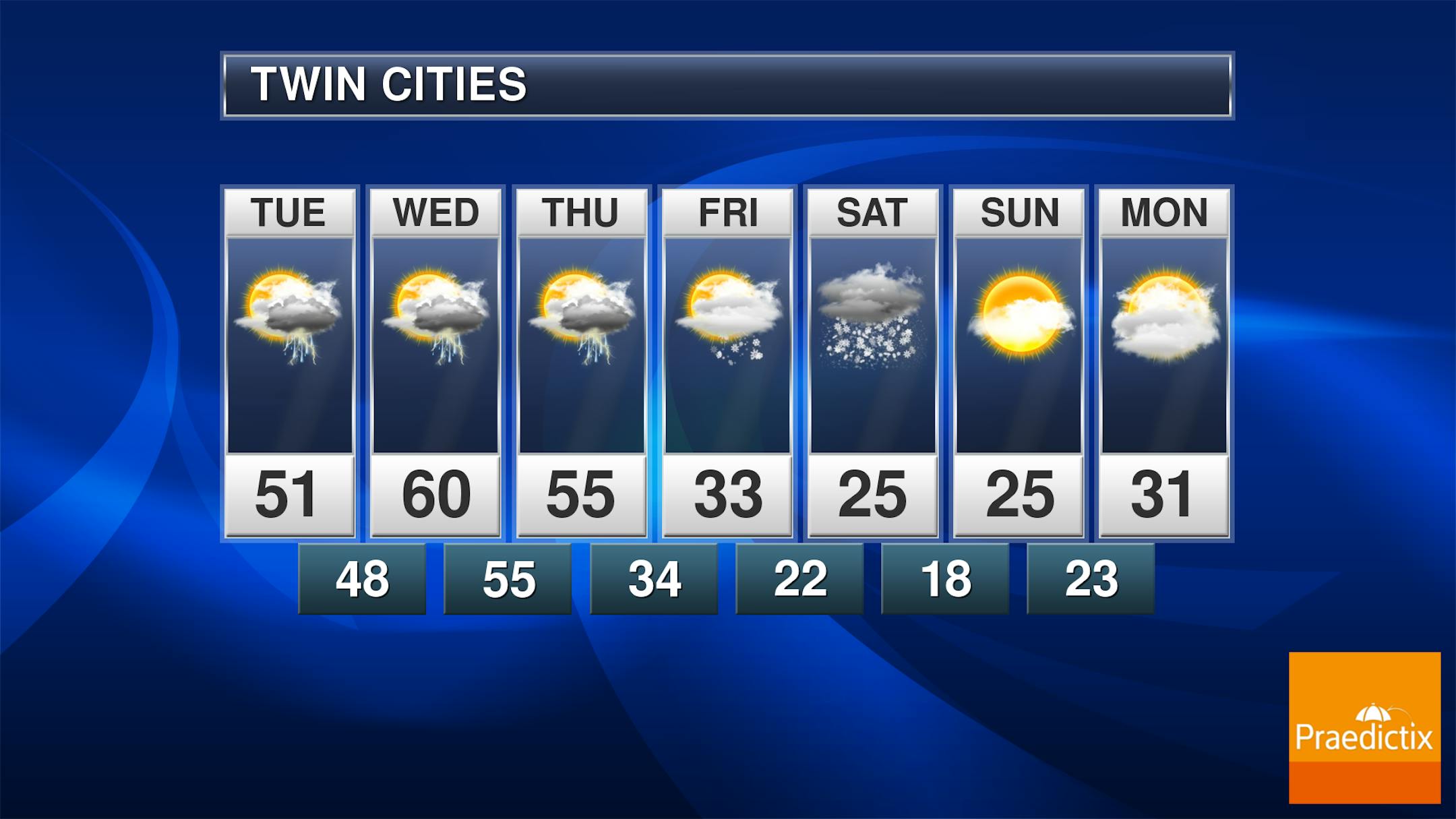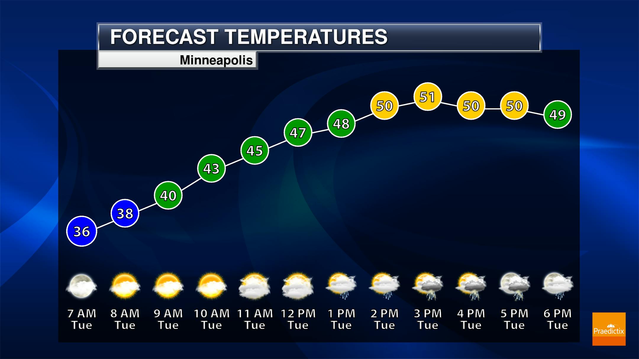 Temps on Tuesday will start off in the mid 30s with highs warming into the low 50s by the afternoon with rain and thunderstorms possible. Southeasterly winds will be breezy with gusts up to 25mph-30mph at times.