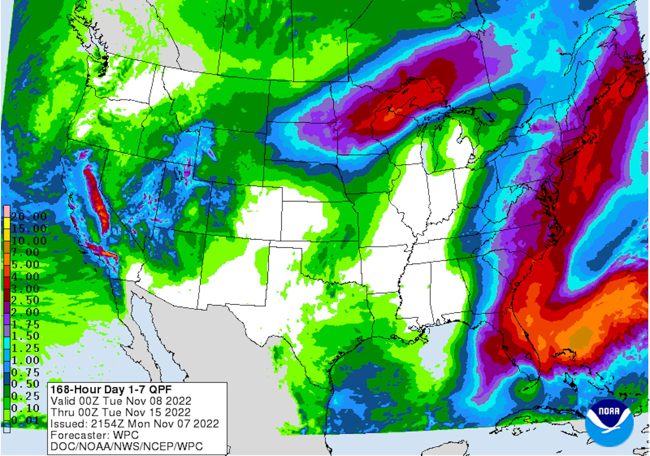 Here's precipitation outlook over the next several days, which shows heavy precipitation over the next several days. Some spots could see 2" to 3" or more of rainfall, which is much needed. Cross your fingers.