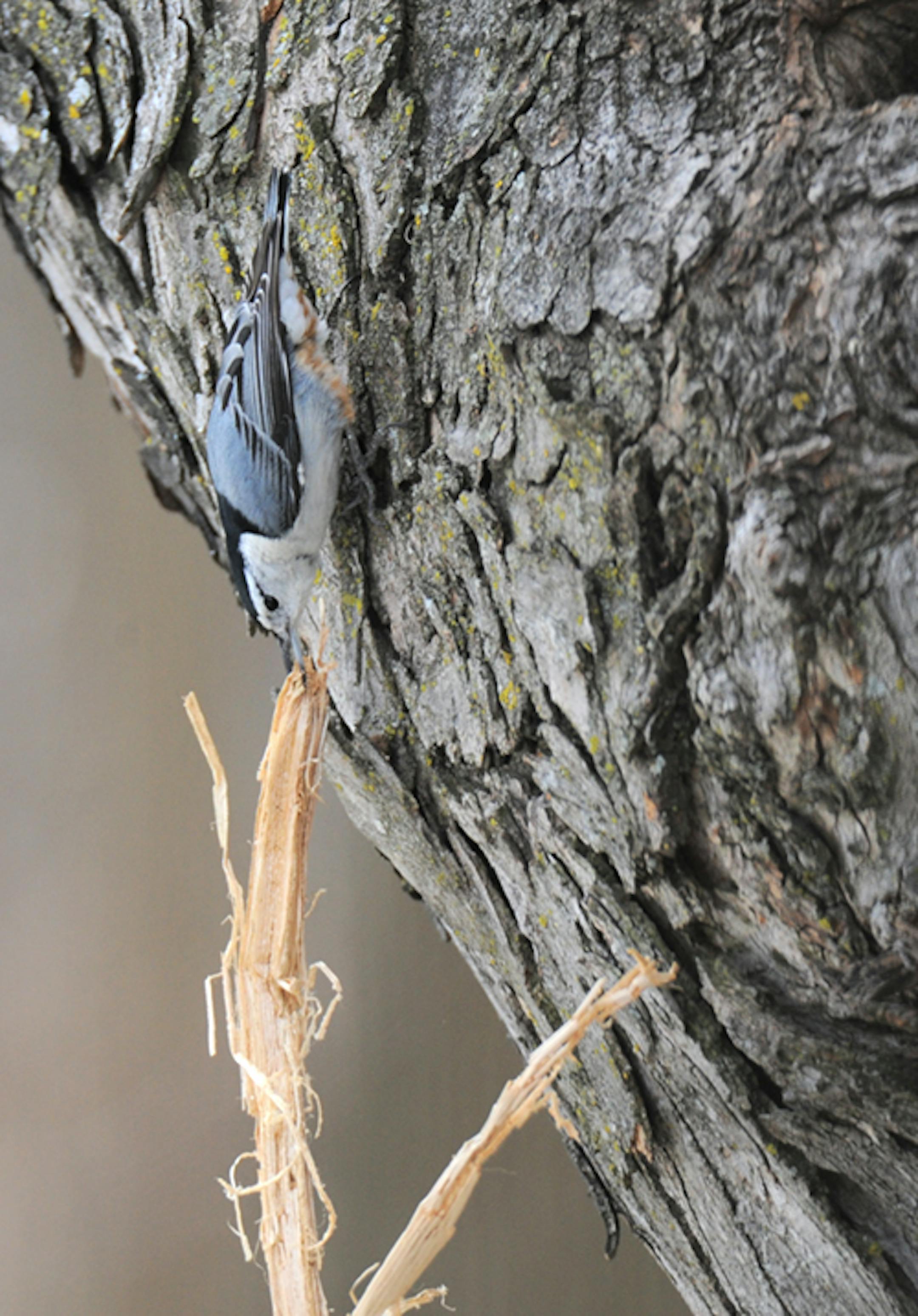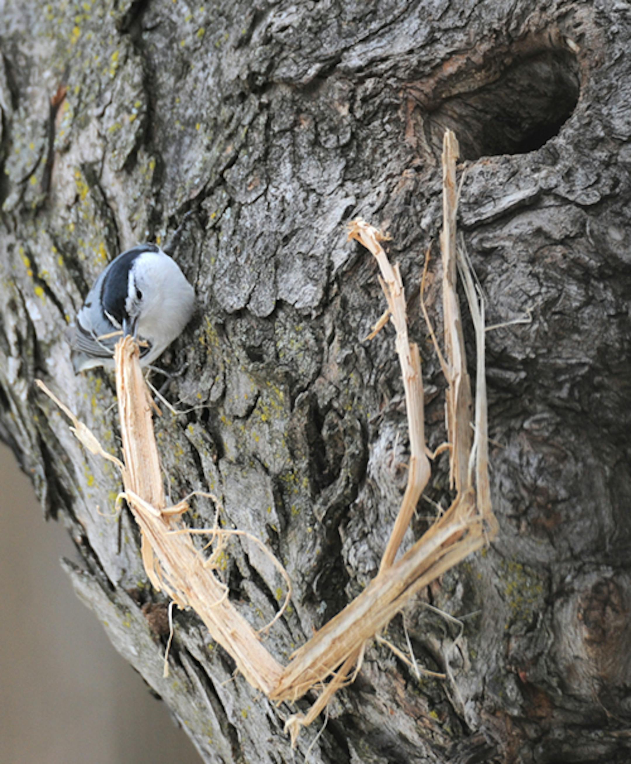 Ever tried to move a large piece of furniture into your house only to find that it would not fit through the door? We have an optimistic and energetic White-breasted Nuthatch working on a nest in a tree cavity that is about 15 feet from our deck. It had that furniture problem this moving. It struggled for a few minutes to drag a large strip of wood into the nest hole, then lost its grip, the wood dropping away. We hope it works with smaller pieces of nesting material, and moves in, which will give us perfect views of the nesting cycle.
