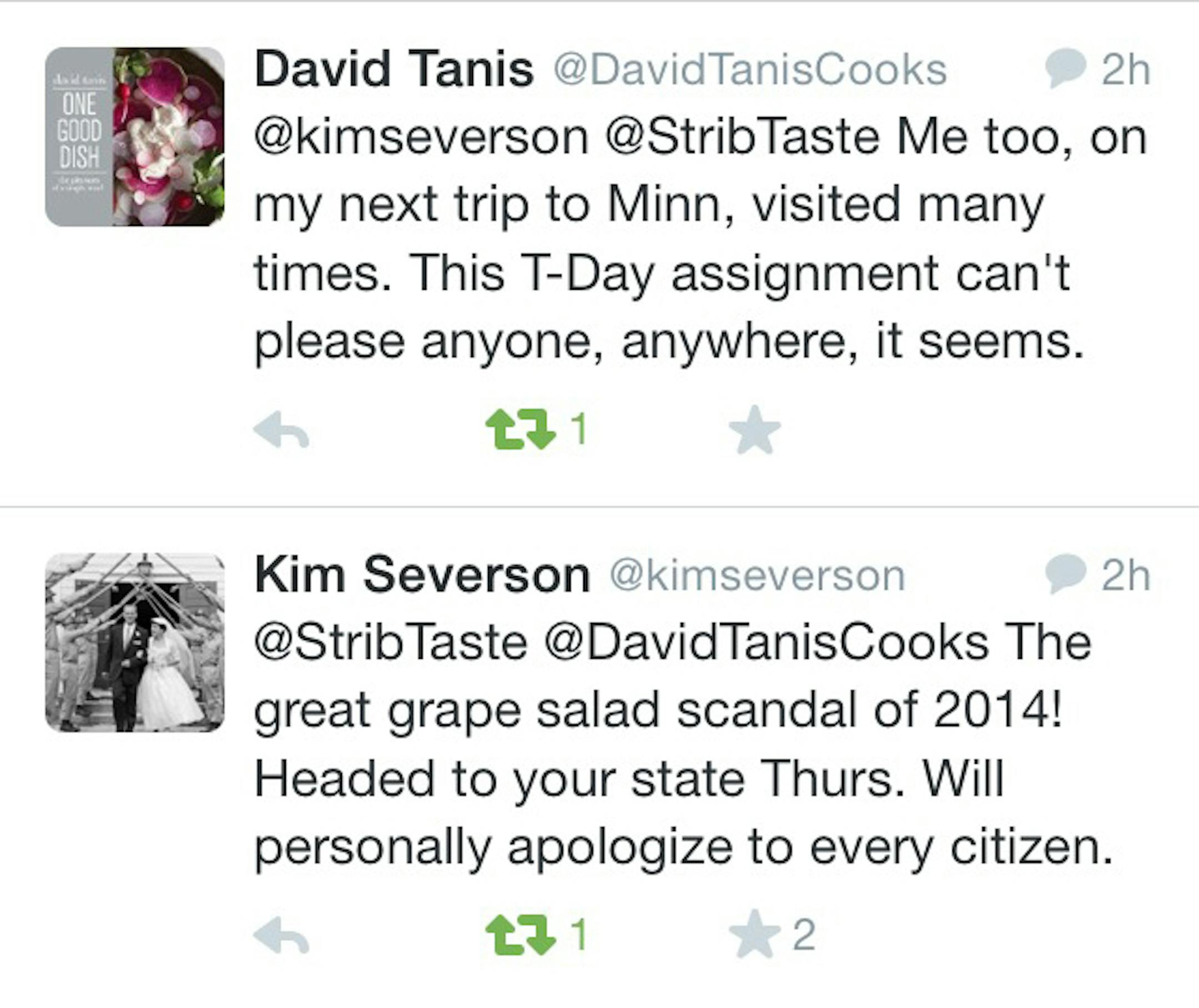 A tweet to the writer of the Minnesota blurb -- David Tanis -- and another NYT food writer -- Kim Severson -- brought some levity from them and what we will accept as an apology.